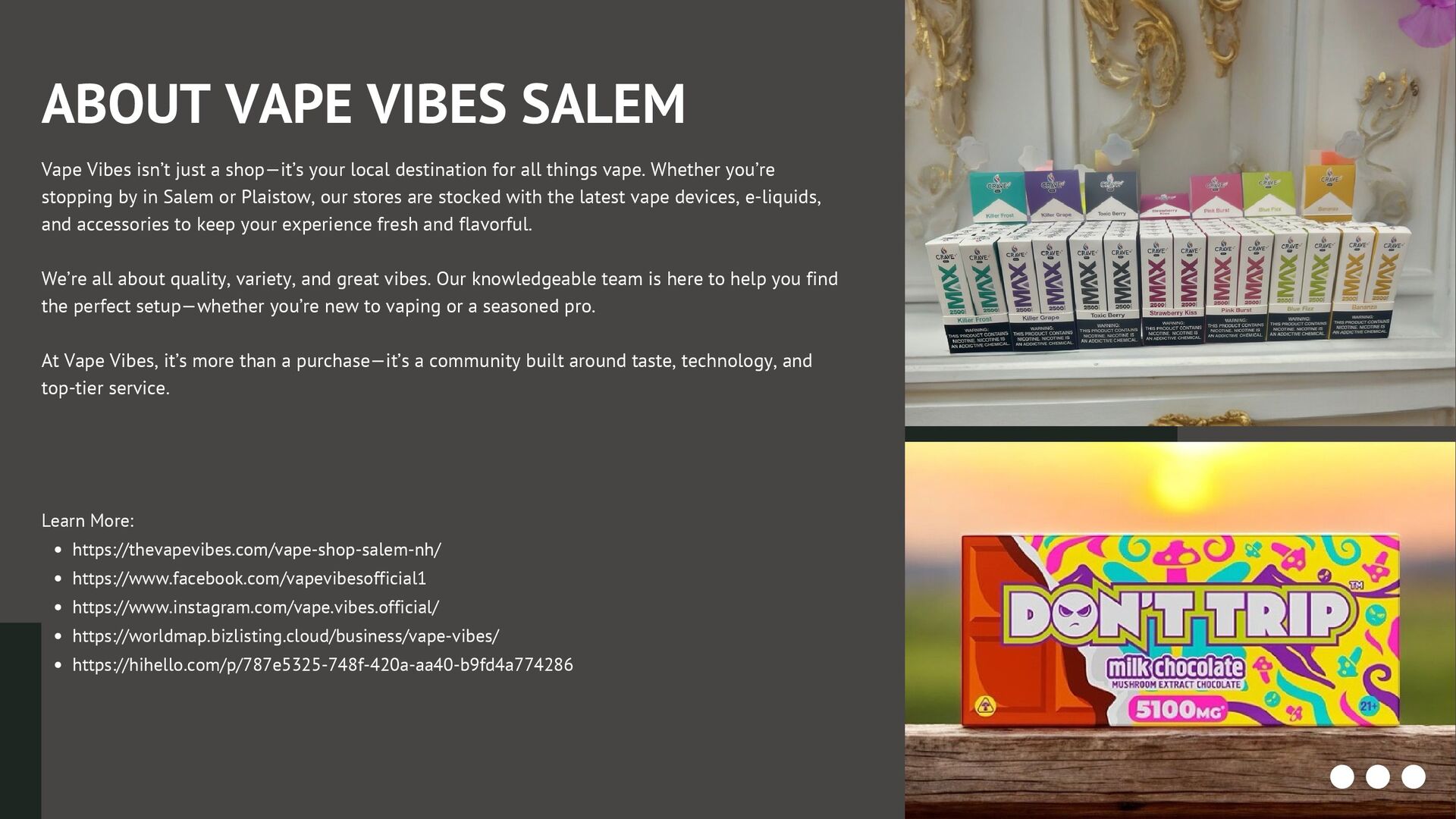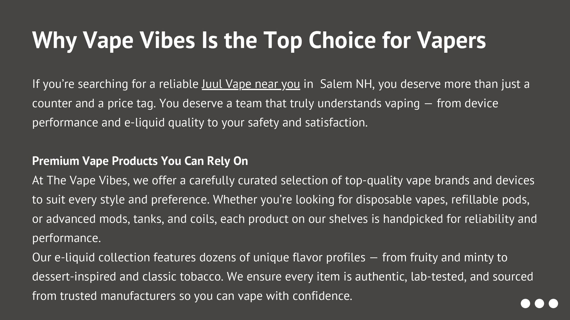 Find authentic Juul vape products in Salem, NH, including devices, flavored pods, chargers, and accessories. We provide genuine Juul selections with expert guidance to help you choose the right setup. Whether you're exploring flavors or picking up a new device, Salem retailers make vaping simple, convenient, and reliable. Experience smooth performance and satisfying vapor from one of the most trusted names in the industry. https://thevapevibes.com/vape-shop-salem-nh/