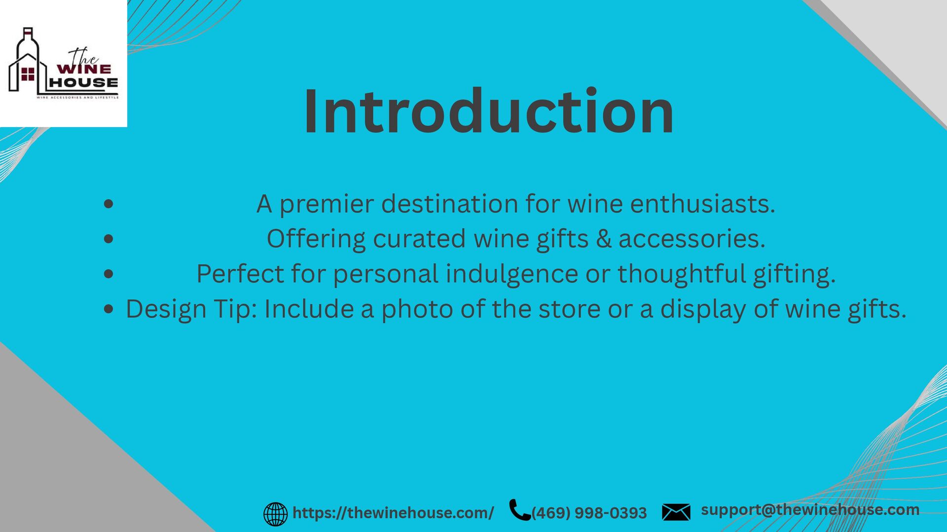 Offering curated wine gifts & accessories. Perfect for personal indulgence or thoughtful gifting. Design Tip: Include a photo of the store or a display of wine gifts. Introduction