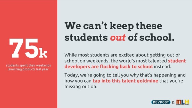 During this talk, we helped a group of university recruiters understand the challenges of hiring amazing student developers and how they can tap into hackathons as a great source of talent.