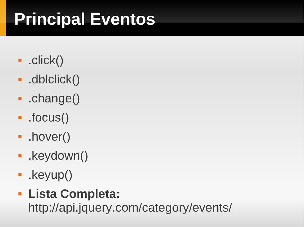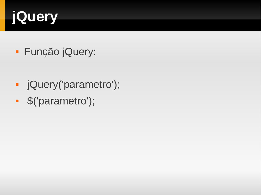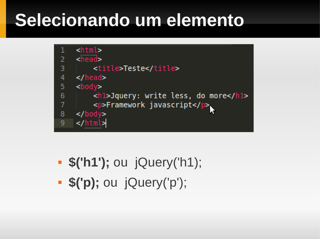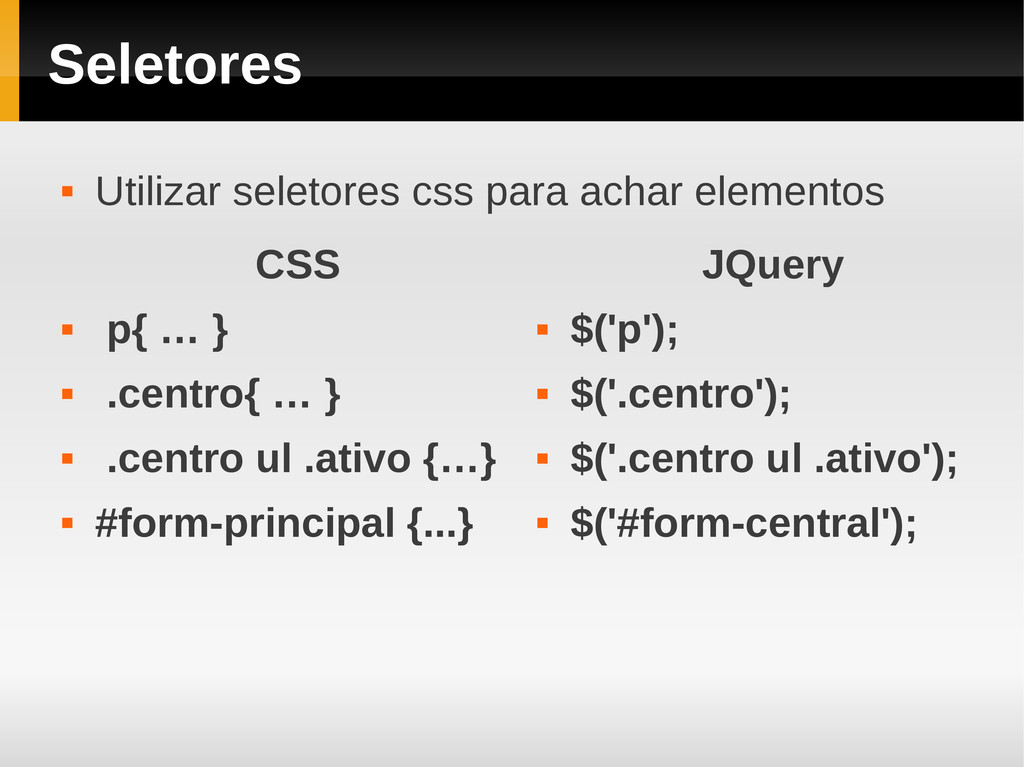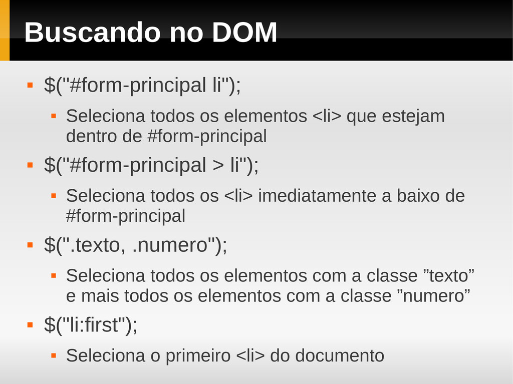 elementos <li> que estejam dentro de #form-principal $("#form-principal > li"); Seleciona todos os <li> imediatamente a baixo de #form-principal $(".texto, .numero"); Seleciona todos os elementos com a classe ”texto” e mais todos os elementos com a classe ”numero” $("li:first"); Seleciona o primeiro <li> do documento