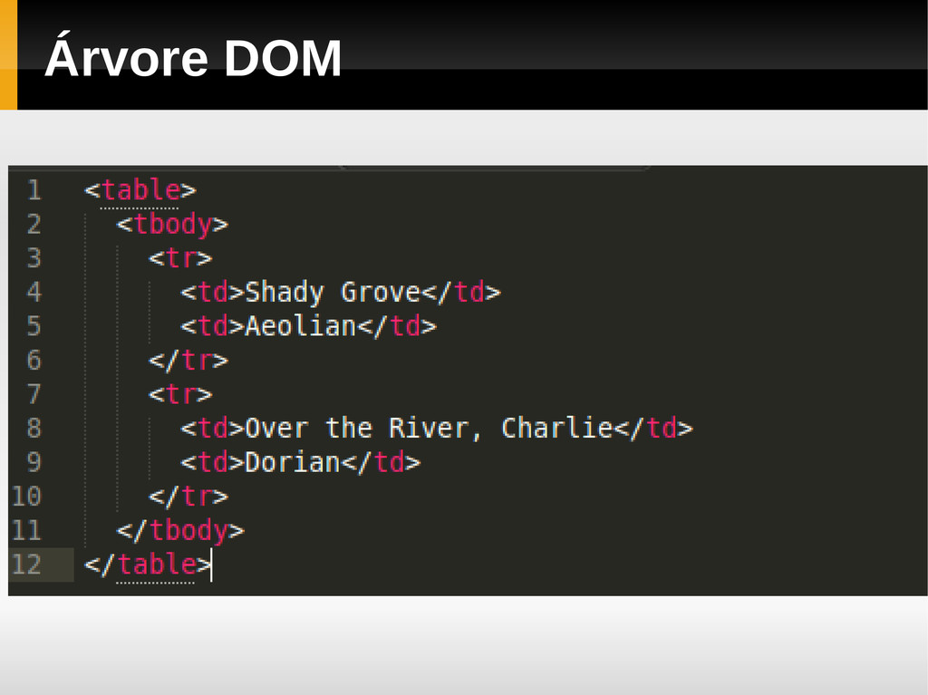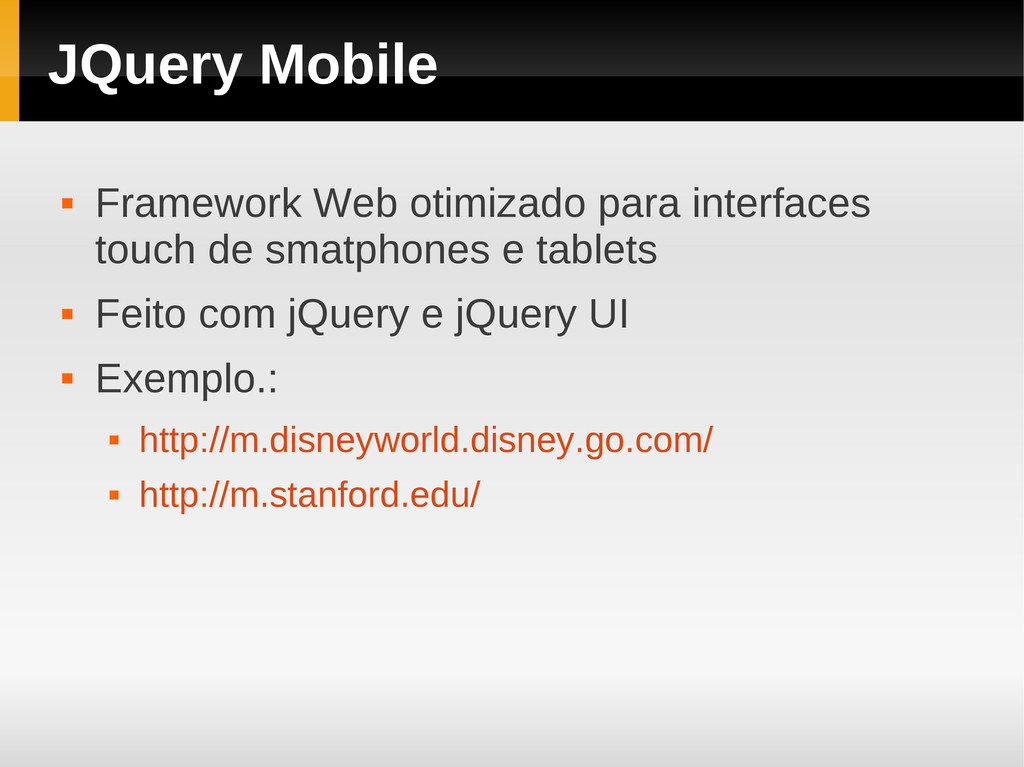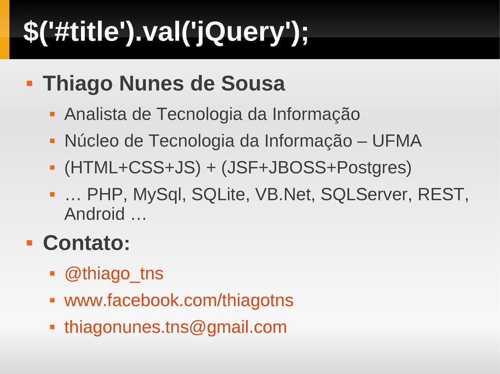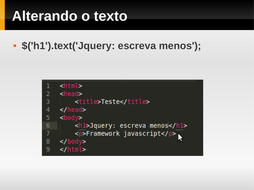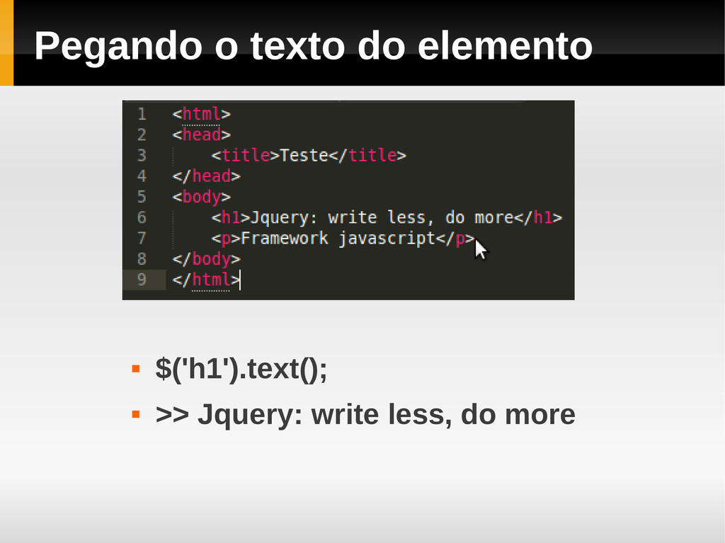 elementos <li> que estejam dentro de #form-principal $("#form-principal > li"); Seleciona todos os <li> imediatamente a baixo de #form-principal $(".texto, .numero"); Seleciona todos os elementos com a classe ”texto” e mais todos os elementos com a classe ”numero” $("li:first"); Seleciona o primeiro <li> do documento