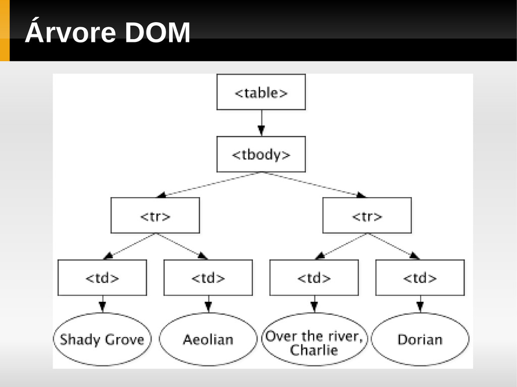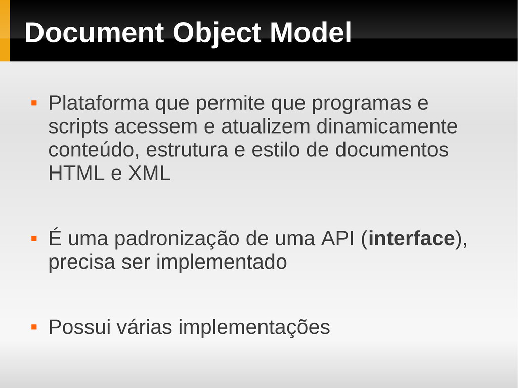 scripts acessem e atualizem dinamicamente conteúdo, estrutura e estilo de documentos HTML e XML É uma padronização de uma API (interface), precisa ser implementado Possui várias implementações
