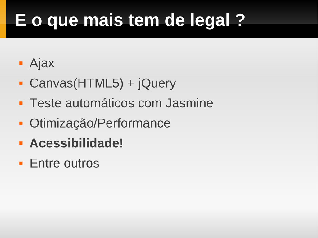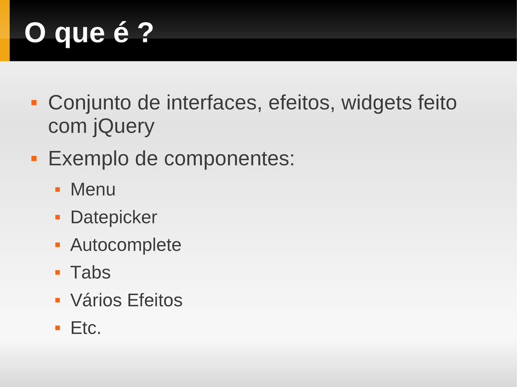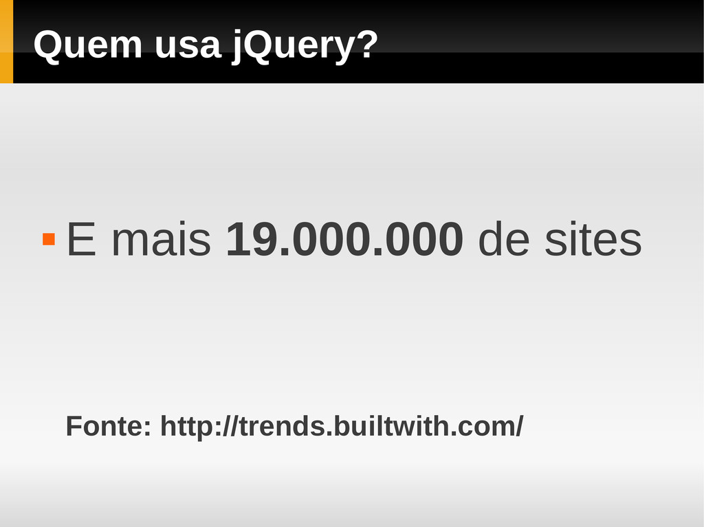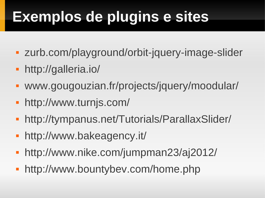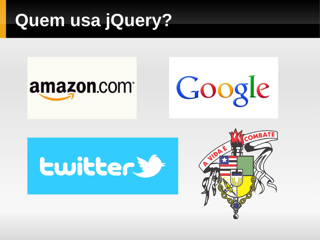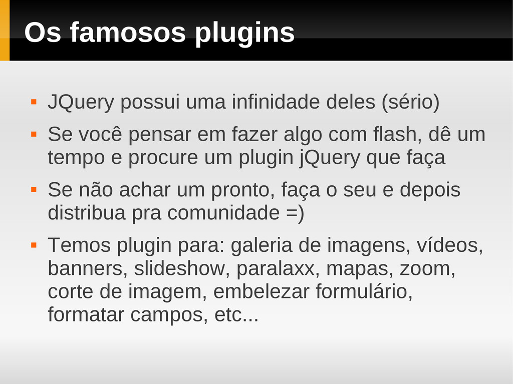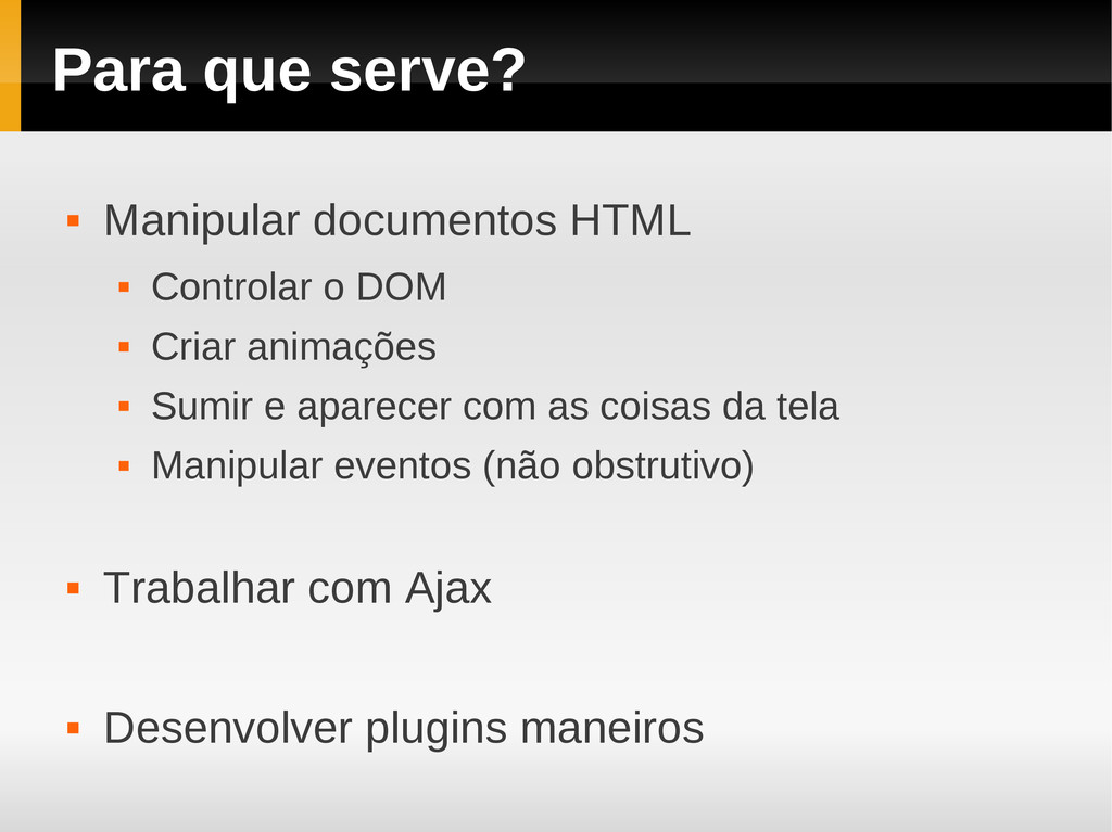 DOM Criar animações Sumir e aparecer com as coisas da tela Manipular eventos (não obstrutivo) Trabalhar com Ajax Desenvolver plugins maneiros