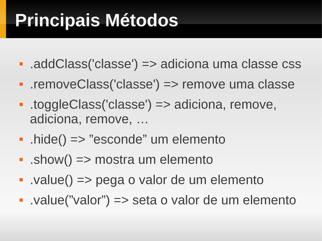 .removeClass('classe') => remove uma classe .toggleClass('classe') => adiciona, remove, adiciona, remove, … .hide() => ”esconde” um elemento .show() => mostra um elemento .value() => pega o valor de um elemento .value(”valor”) => seta o valor de um elemento