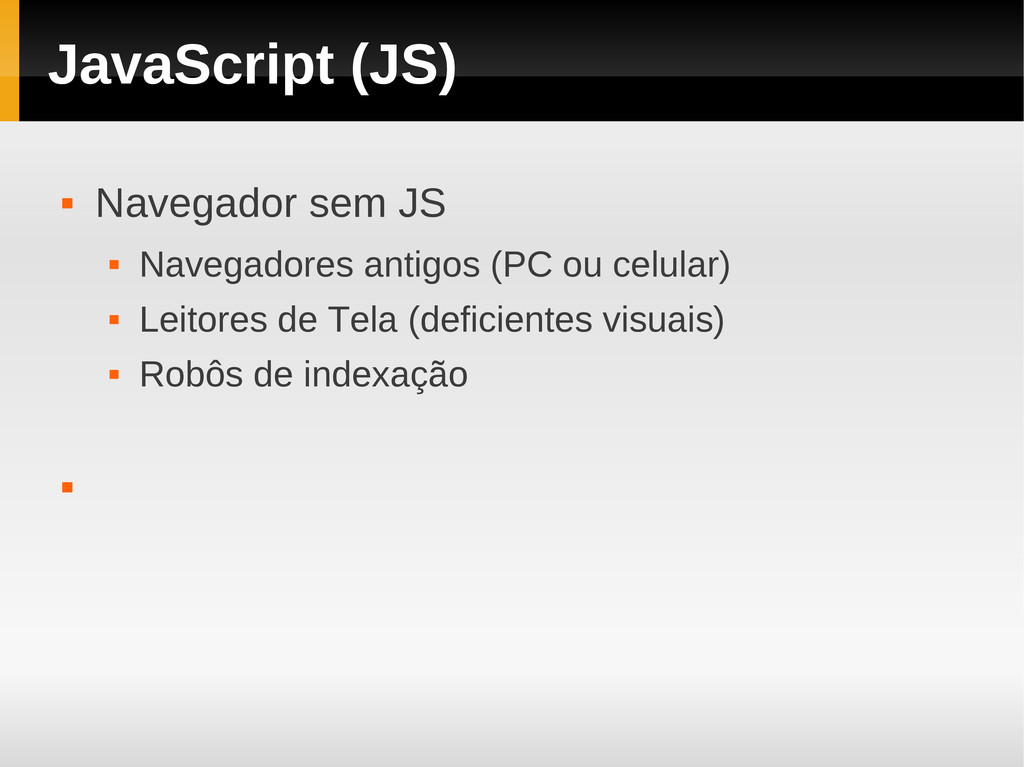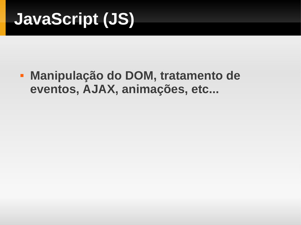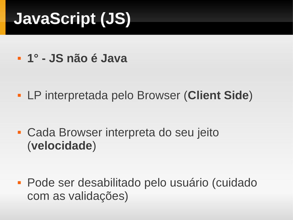 LP interpretada pelo Browser (Client Side) Cada Browser interpreta do seu jeito (velocidade) Pode ser desabilitado pelo usuário (cuidado com as validações)