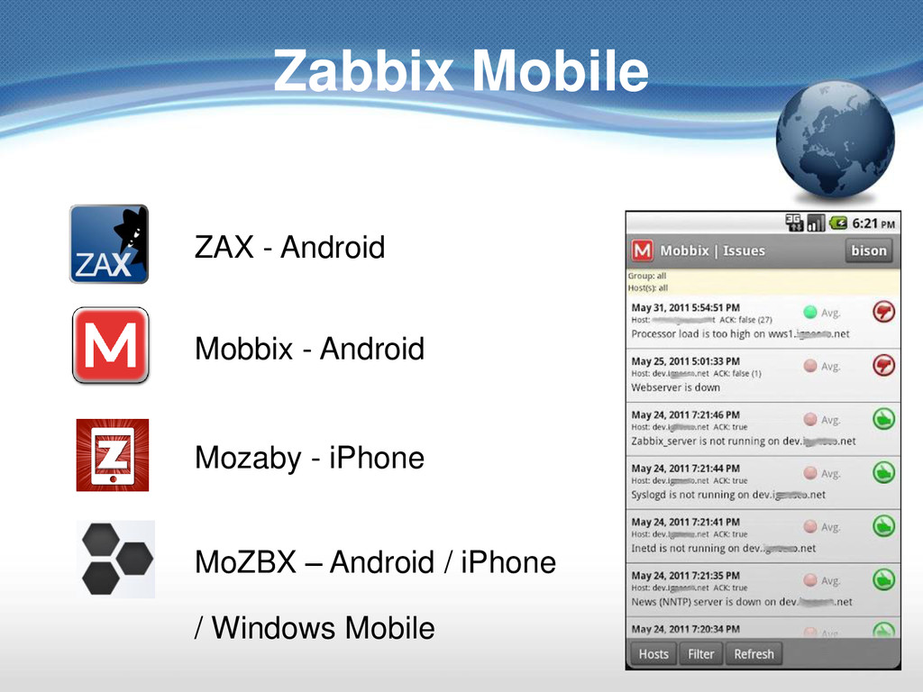 Enterprise) • Preparado para controle dos pequenos e grandes ambientes distribuídos • Sem add-nos proprietários e sem edições profissionais ou demo • Extremamente flexível! Triggers, escalations, new checks, screens, etc. • Projetado para lidar com comunicações instáveis