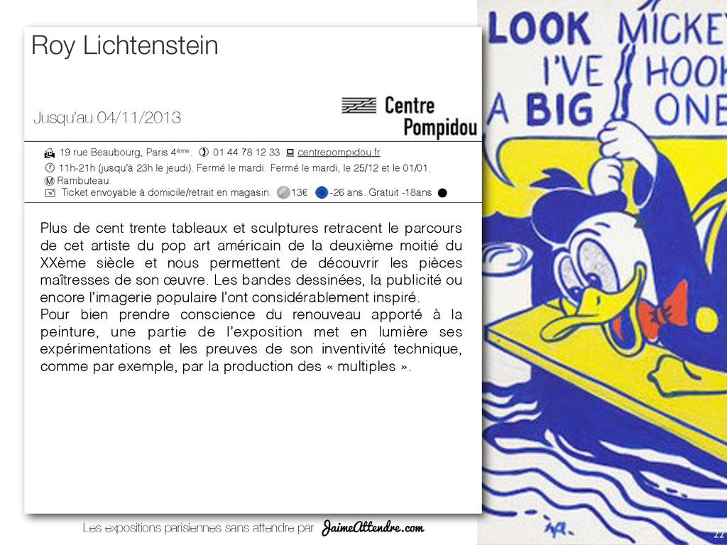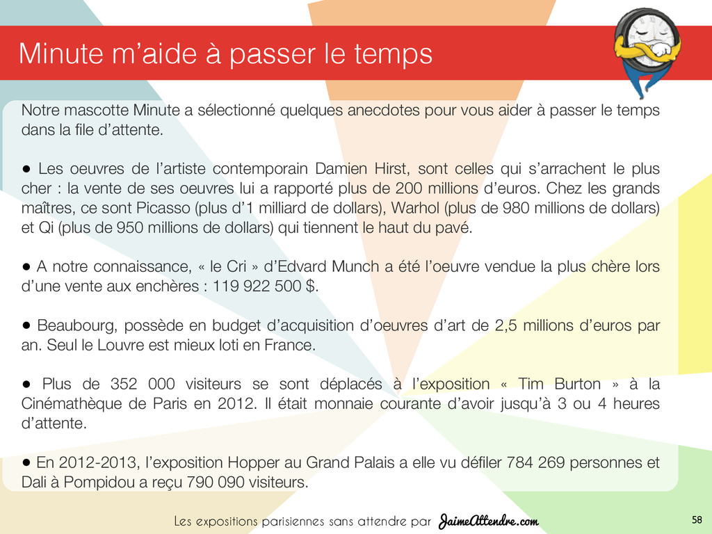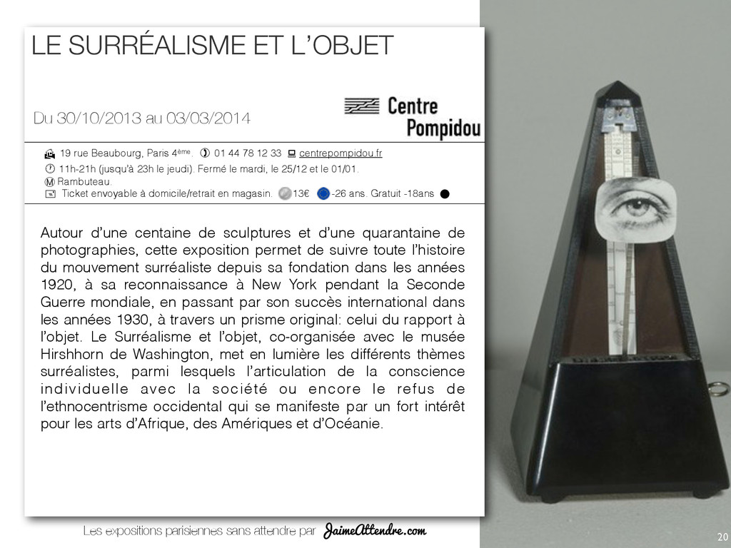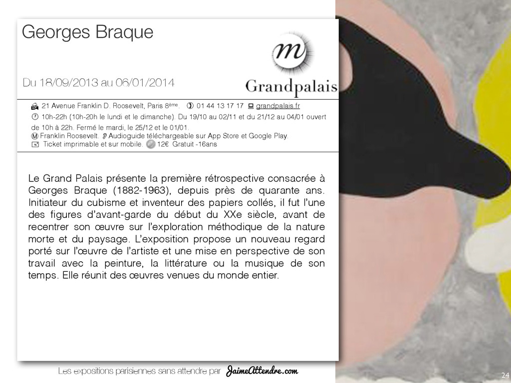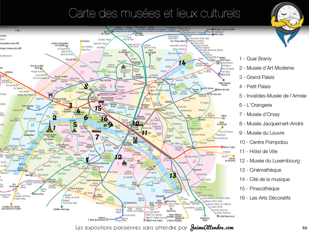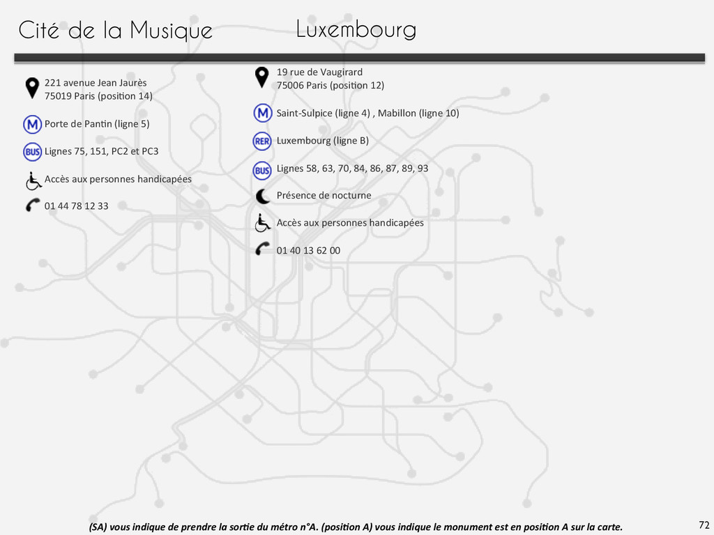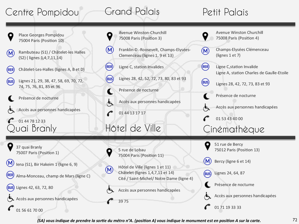 Franklin-‐D.-‐Roosevelt, Champs-‐Elysées-‐ Clemenceau (lignes 1, 9 et 13) Ligne C, sta@on Invalides Lignes 28, 42, 52, 72, 73, 80, 83 et 93 Présence de nocturne Accès aux personnes handicapées 01 44 13 17 17 37 quai Branly 75007 Paris (Posi@on 1) Iena (S1), Bir Hakeim 1 (ligne 6, 9) Alma-‐Monceau, champ de Mars (ligne C) Lignes 42, 63, 72, 80 Accès aux personnes handicapées 01 56 61 70 00 Avenue Winston Churchill 75008 Paris (Posi@on 4) Champs-‐Elysées Clémenceau (lignes 1 et 7) Ligne C,sta@on Invalide Ligne A, sta@on Charles de Gaulle-‐Etoile Lignes 28, 42, 72, 73, 83 et 93 Présence de nocturne Accès aux personnes handicapées 01 53 43 40 00 51 rue de Bercy 75012 Paris (Posi@on 13) Bercy (ligne 6 et 14) Lignes 24, 64, 87 Présence de nocturne Accès aux personnes handicapées 01 71 19 33 33 72 Hôtel de Ville 5 rue de Lobau 75004 Paris (Posi@on 11) Hôtel de Ville (lignes 1 et 11) Châtelet (lignes 1,4,7,11 et 14) Cité / Saint-‐Michel/ Notre Dame (ligne 4) Accès aux personnes handicapées 39 75 Place Georges Pompidou 75004 Paris (Posi@on 10) Rambuteau (S1) / Châtelet-‐les Halles (S2) ( lignes 1,4,7,11,14) Châtelet-‐Les-‐Halles (lignes A, B et D) Lignes 21, 29, 38, 47, 58, 69, 70, 72, 74, 75, 76, 81, 85 et 96 Présence de nocturne Accès aux personnes handicapées 01 44 78 12 33 Centre Pompidou (SA) vous indique de prendre la sor3e du métro n°A. (posi3on A) vous indique le monument est en posi3on A sur la carte. Quai Branly Cinémathèque