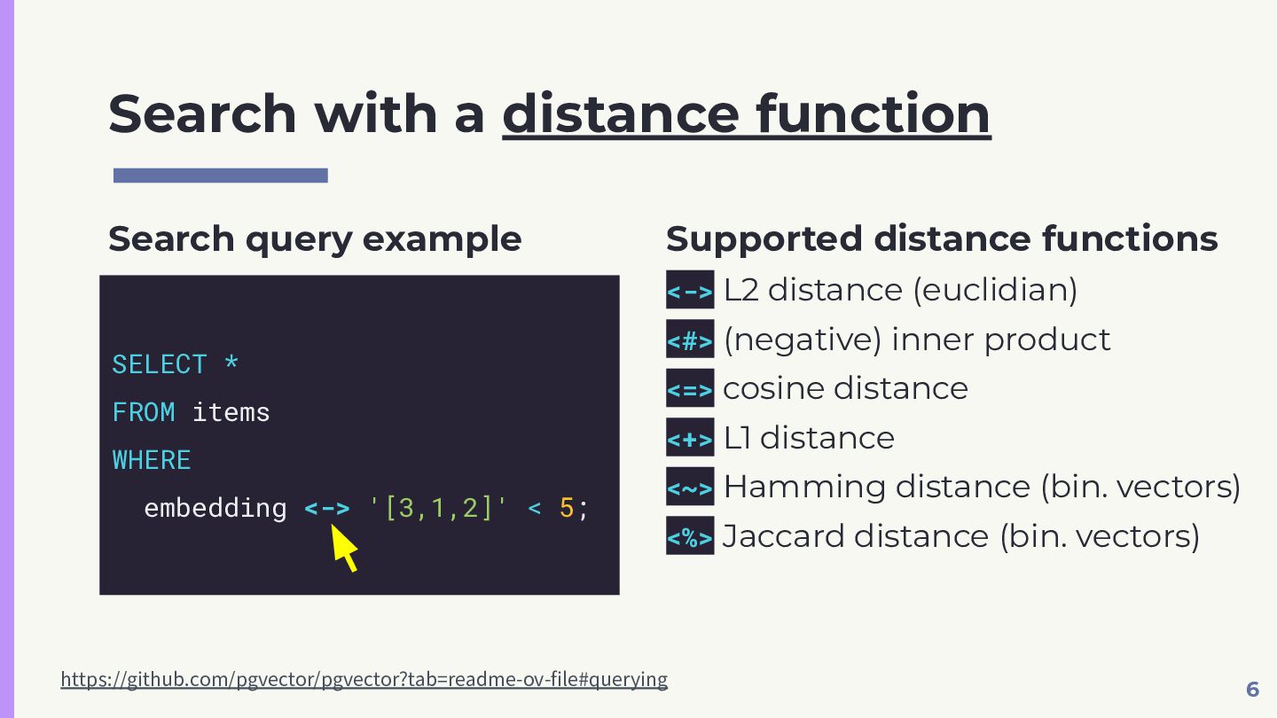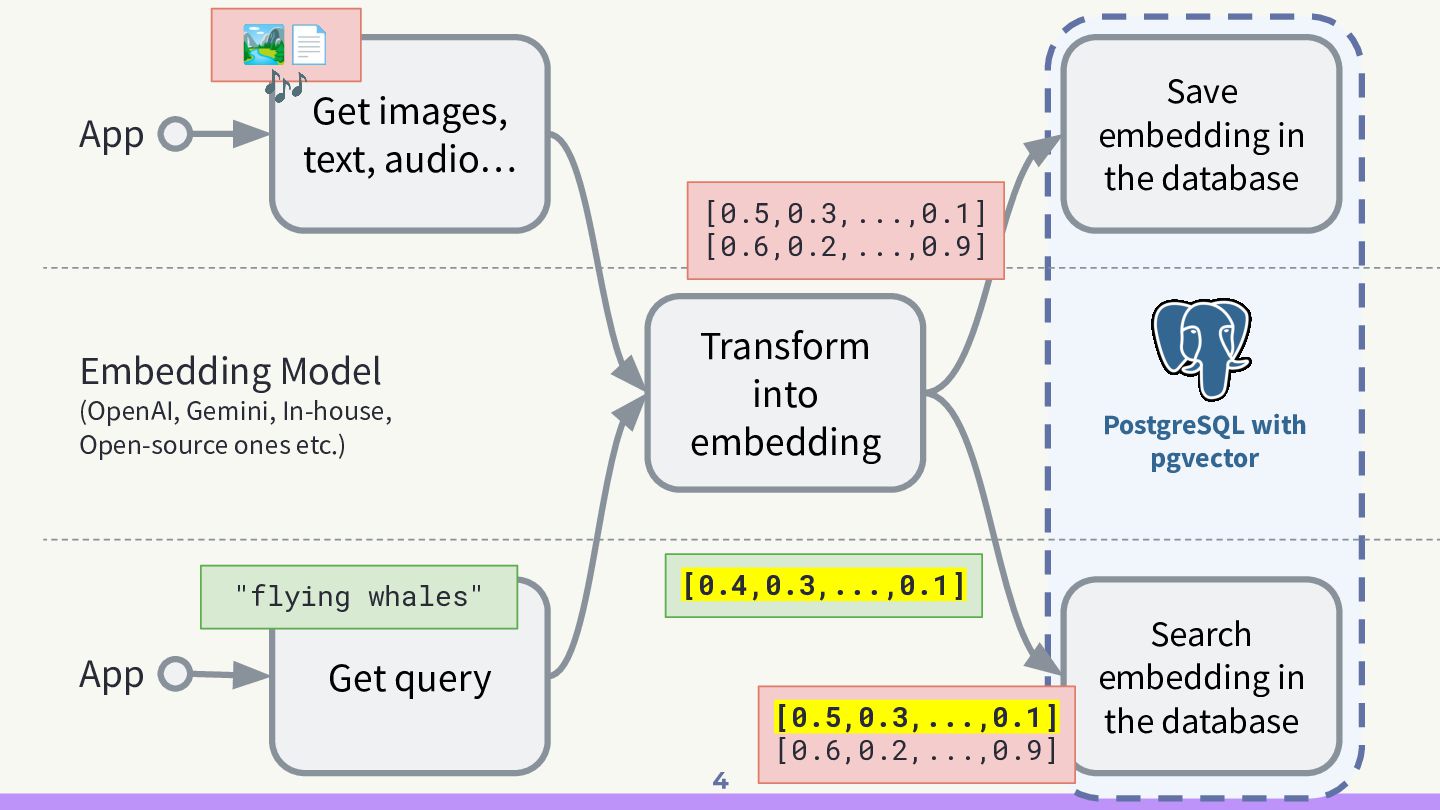 embedding Save embedding in the database Embedding Model (OpenAI, Gemini, In-house, Open-source ones etc.) App Get query Search embedding in the database App 🏞📄 🎶 [0.5,0.3,...,0.1] [0.6,0.2,...,0.9] "flying whales" [0.5,0.3,...,0.1] [0.6,0.2,...,0.9] [0.4,0.3,...,0.1]