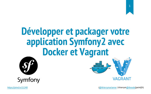 n t . c o n f i g u r e ( " 2 " ) d o | c o n f i g | c o n f i g . v m . p r o v i s i o n " d o c k e r " , i m a g e s : [ " a f u p / s y m f o n y 2 " ] e n d • Rôle aussi tenu par Shell / Puppet / Chef => Container Application 0 1 . 0 2 . 0 3 . 0 4 . https://joind.in/11240 (@thierrymarianne | thierrym@theodo[point]fr) 12