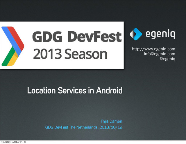 Presentation given at GDGDevFest NL 2013. Presentation about available location services in android and how to use them. Including a basic overview of how mobile devices use GPS to get your location.