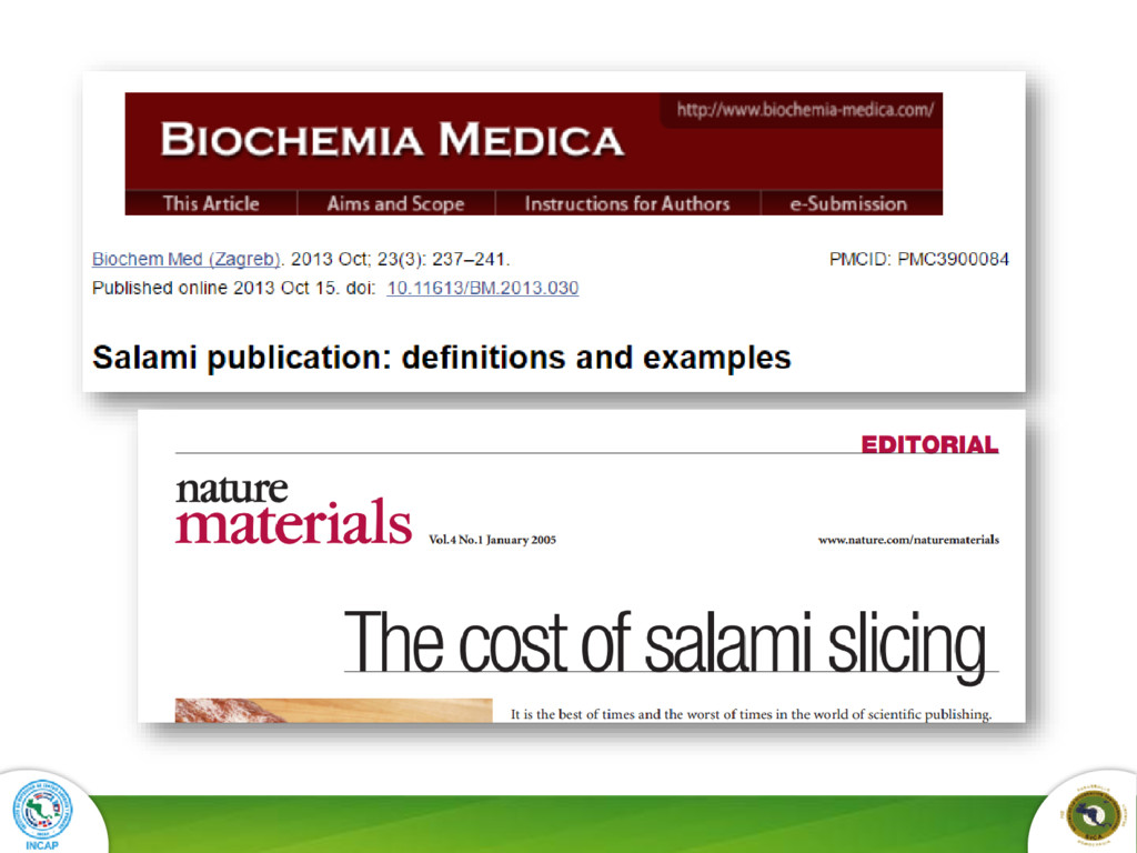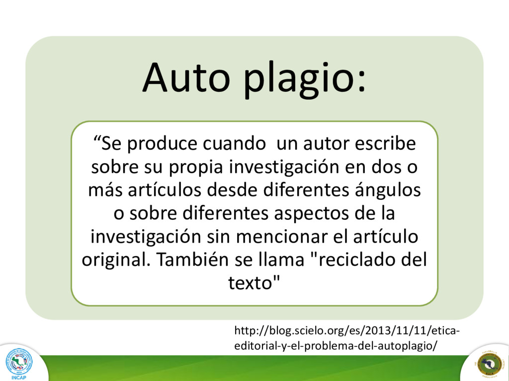 propia investigación en dos o más artículos desde diferentes ángulos o sobre diferentes aspectos de la investigación sin mencionar el artículo original. También se llama "reciclado del texto" http://blog.scielo.org/es/2013/11/11/etica- editorial-y-el-problema-del-autoplagio/
