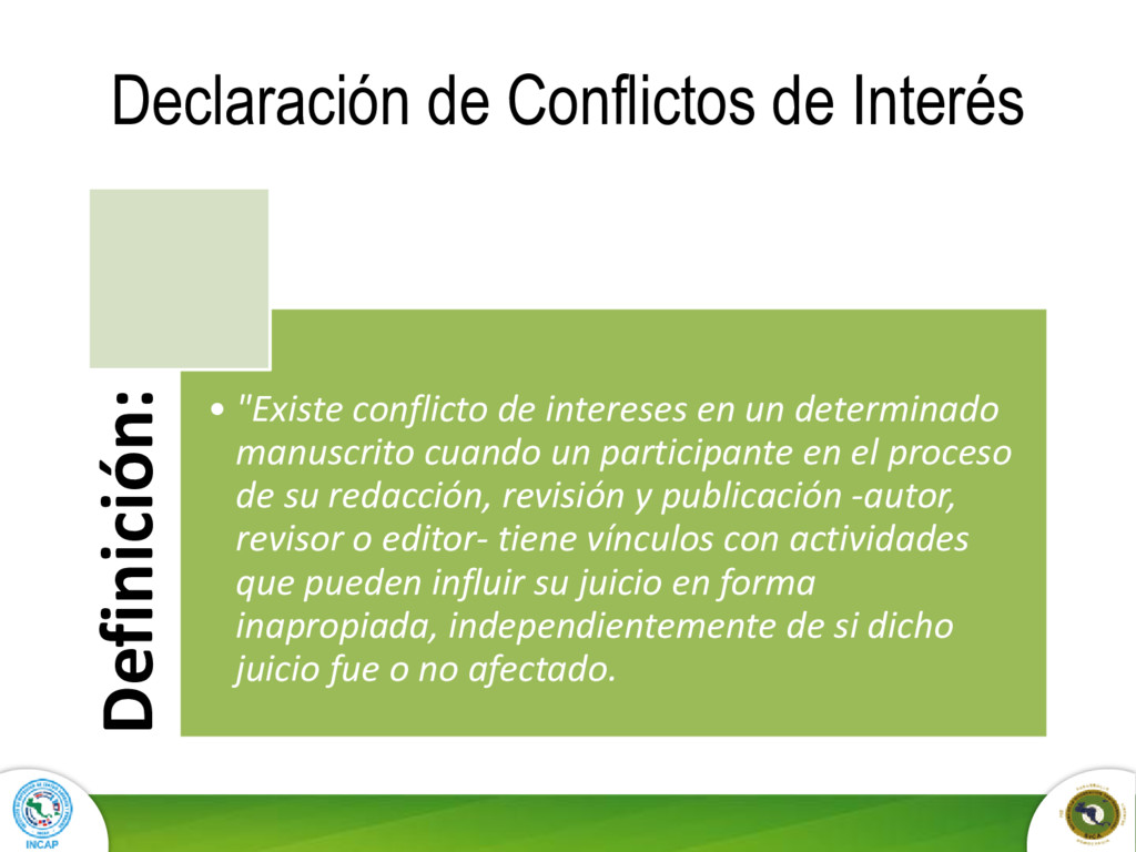 intereses en un determinado manuscrito cuando un participante en el proceso de su redacción, revisión y publicación -autor, revisor o editor- tiene vínculos con actividades que pueden influir su juicio en forma inapropiada, independientemente de si dicho juicio fue o no afectado.