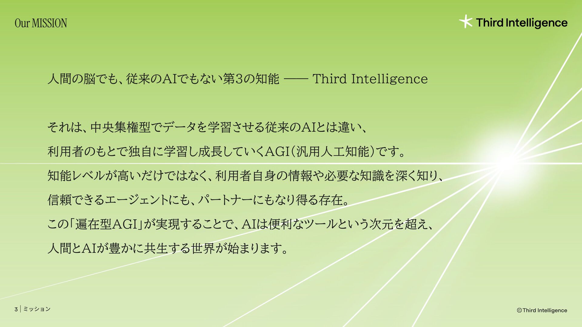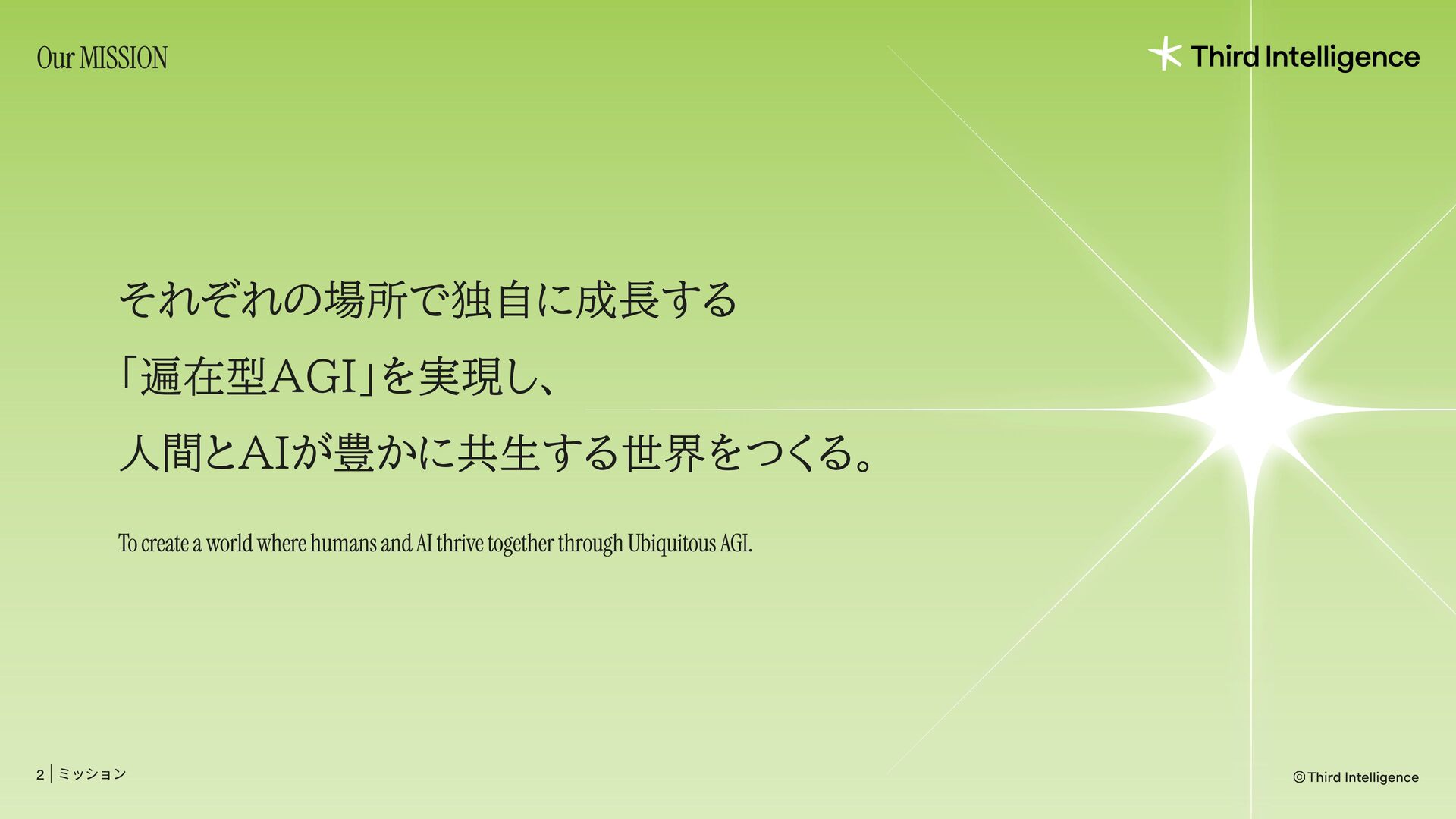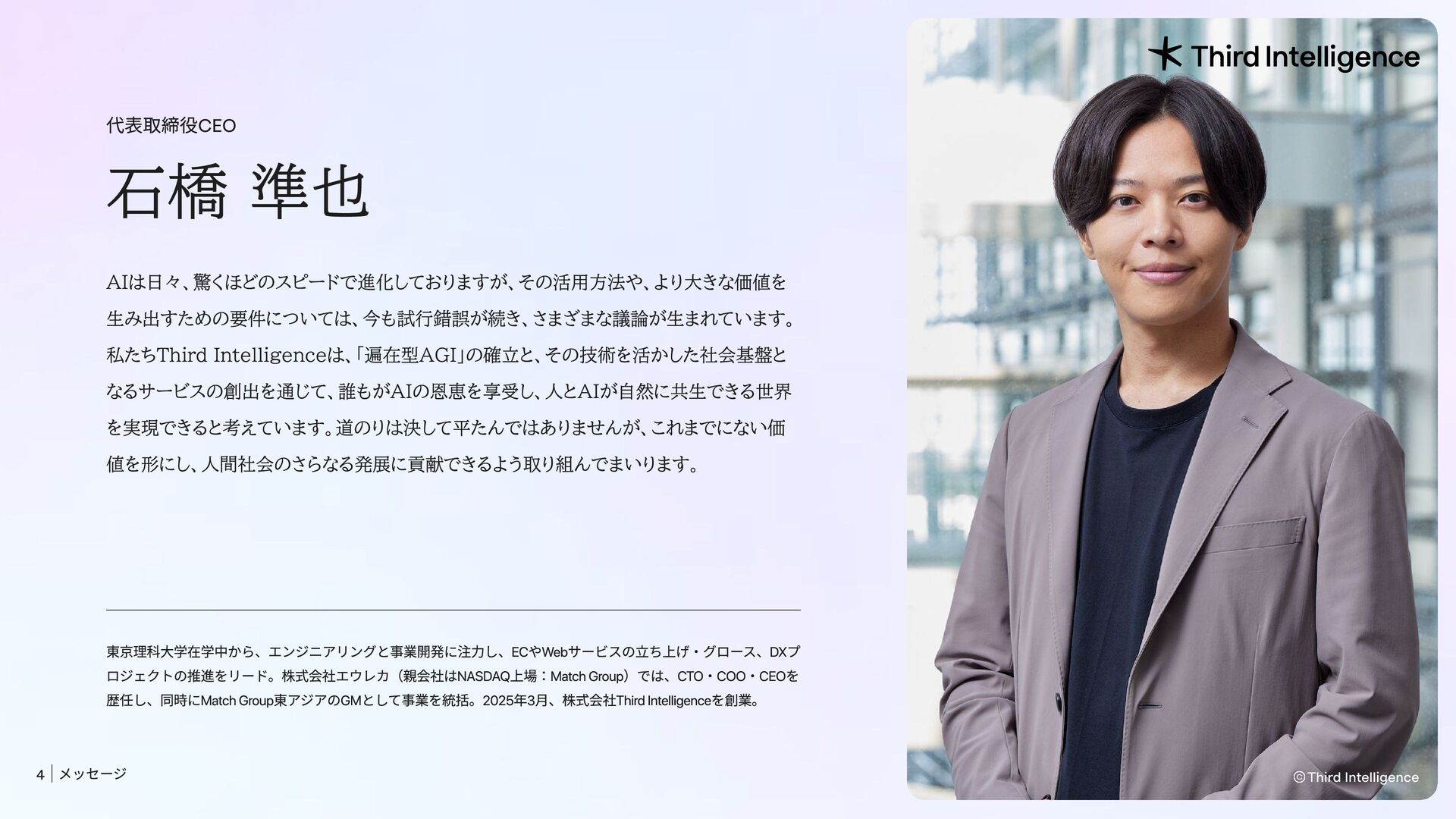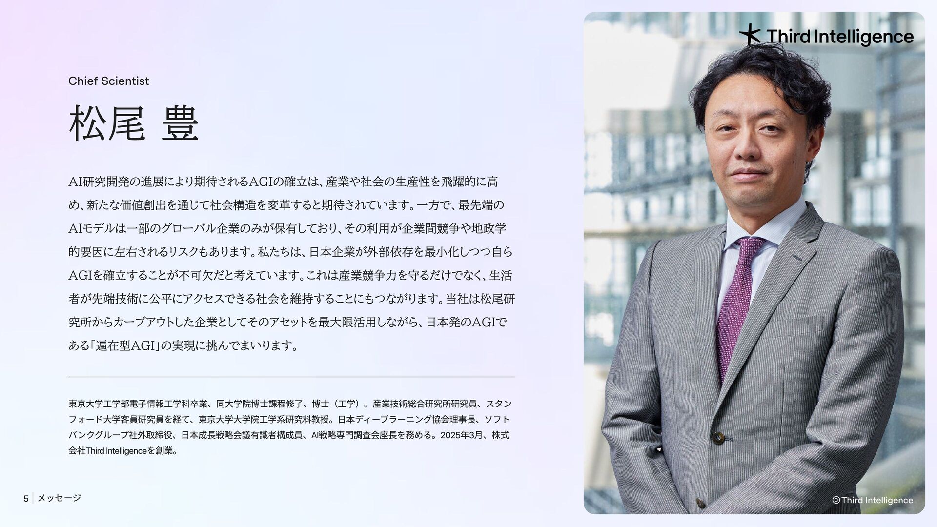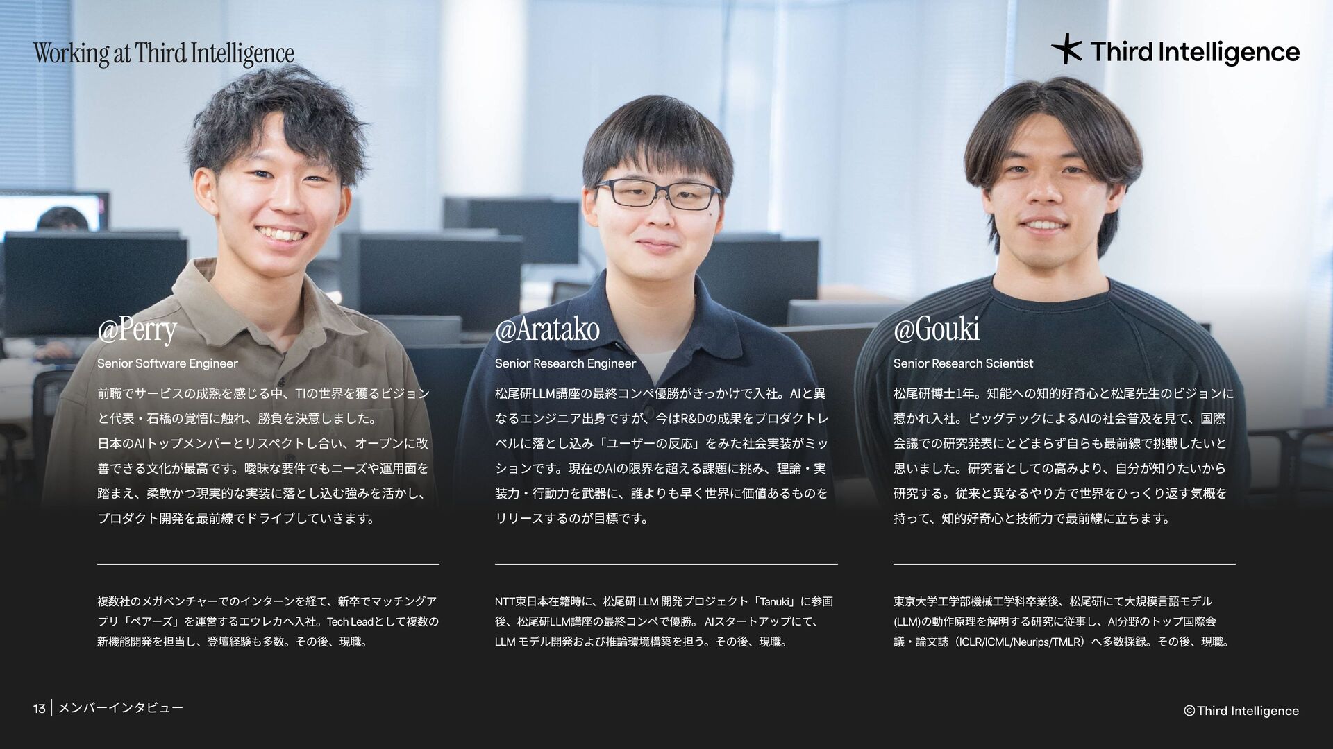 次の目標は、世界の覇権を取れる次世代AIの創出です。 その鍵の一つは、個人に寄り添い共に成長する「遍在型AGI」をいち早く実現することです。 しかし現在のTransformerは学習効率に大きな課題があり、ユーザーの日常に真に密着した学習や推論を行うことが困難です。 また、モデルの認識性能の限界や報酬設計におけるスパース性の問題も顕在化しています。 Third Intelligenceは、新たなAI理論とプロダクト開発力を基軸に、AIと人が共に成長する世界の実現に挑んでいます。 理論・実装力・行動力を武器に、最上級を目指せる研究者・開発者を求めています。 早稲田大学大学院先進理工学研究科博士課程修了。博士(工学)。同大学および東京科学大学を経て、現在、東京大学大学院工学系研究科特任准教授。 大規模言語モデルのフルスクラッ チ学習(Tanuki-8x8B)や、医療領域特化型モデルの開発プロジ ェクトにおいて開発チー ムリー ダー を務める。 He ad of AI De vel opment 畠山 歓