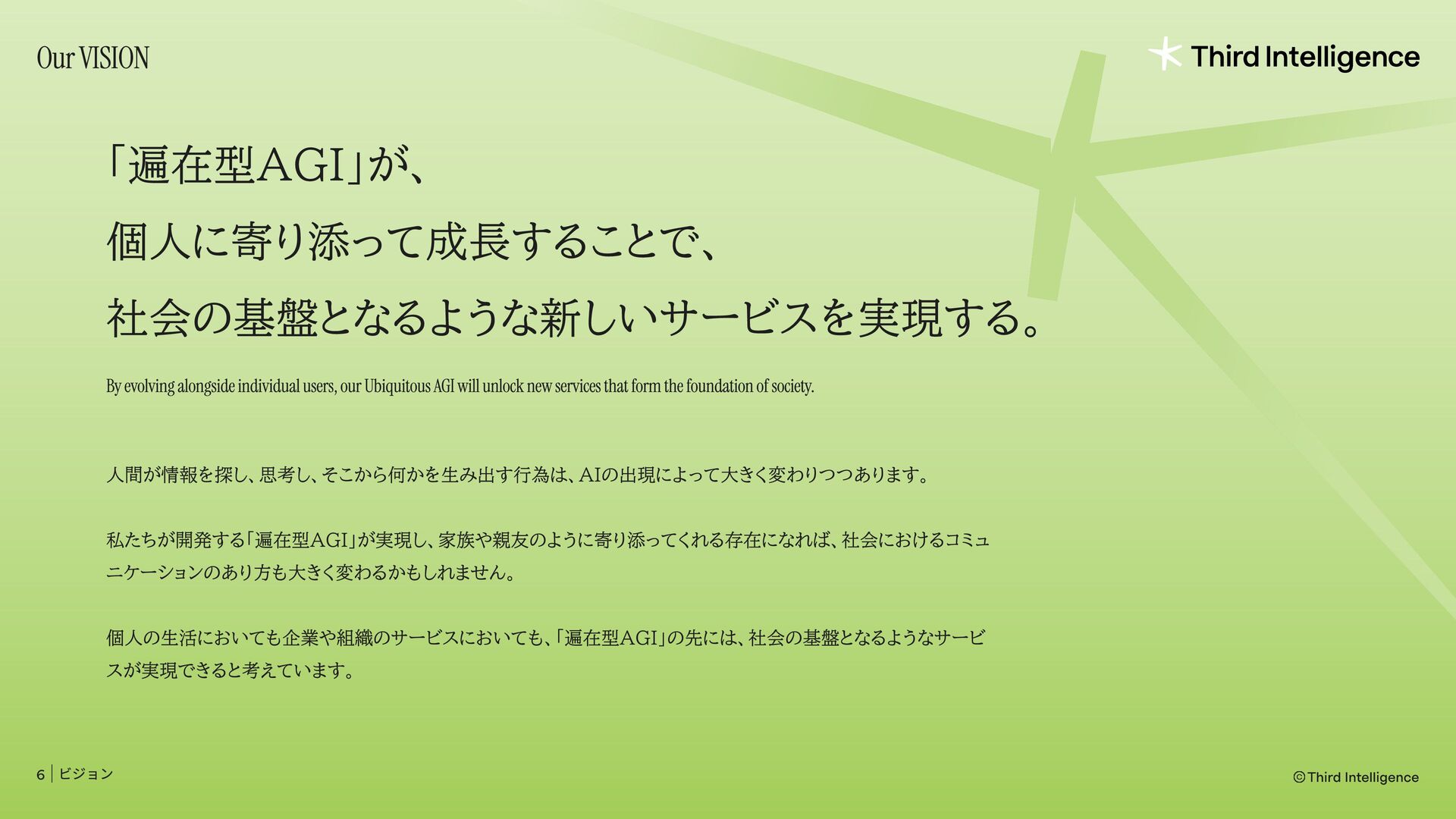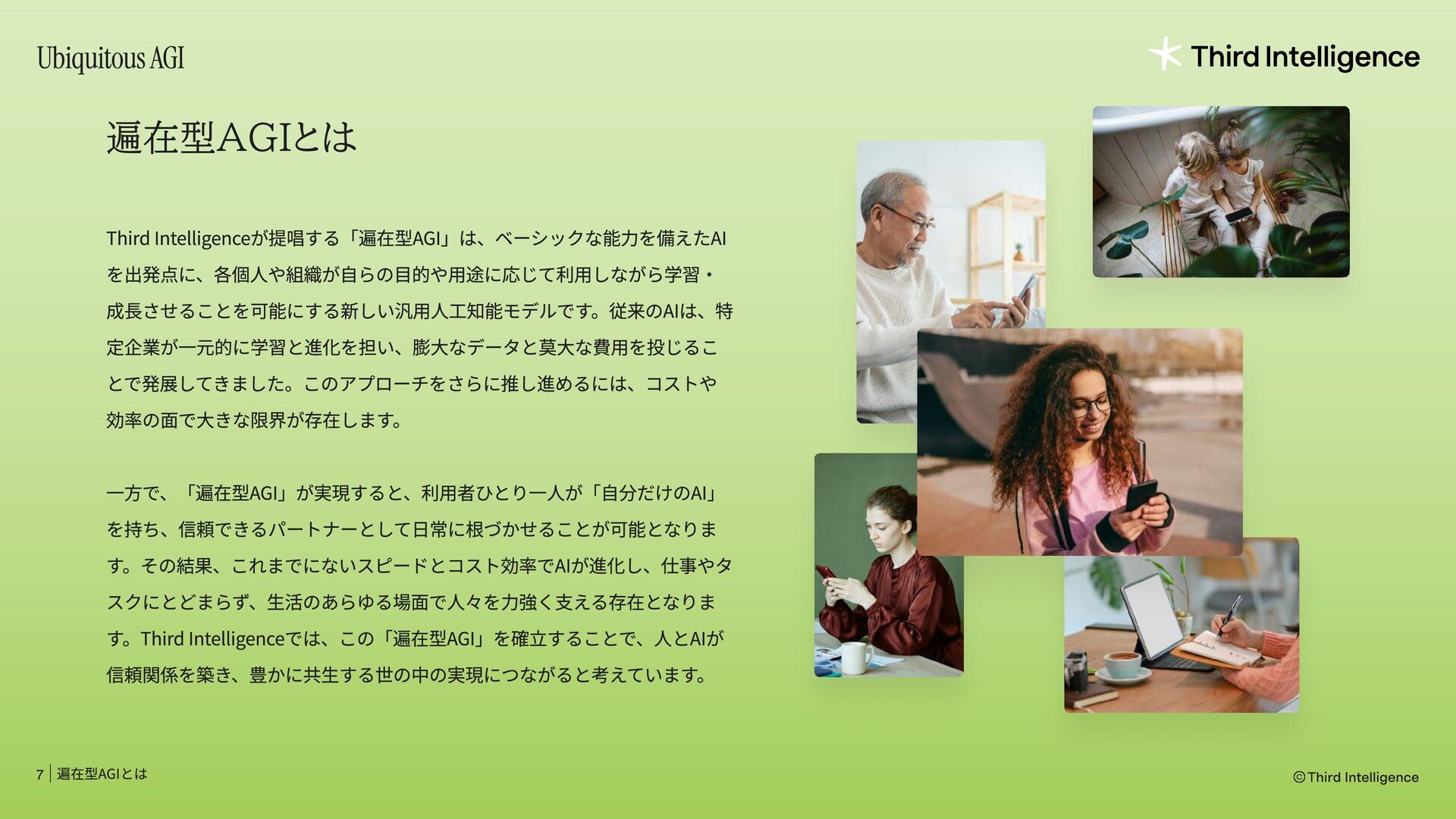 evolving alongside individual users, our Ubiquitous AGI will unlock new services that form the foundation of society. 人間が情報を探し、思考し、そこから何かを生み出す行為は、AIの出現によって大きく変わりつつあります。 私たちが開発する「遍在型AGI」が実現し、家族や親友のように寄り添ってくれる存在になれば、社会におけるコミュ ニケーションのあり方も大きく変わるかもしれません。 個人の生活においても企業や組織のサービスにおいても、「遍在型AGI」の先には、社会の基盤となるようなサービ スが実現できると考えています。