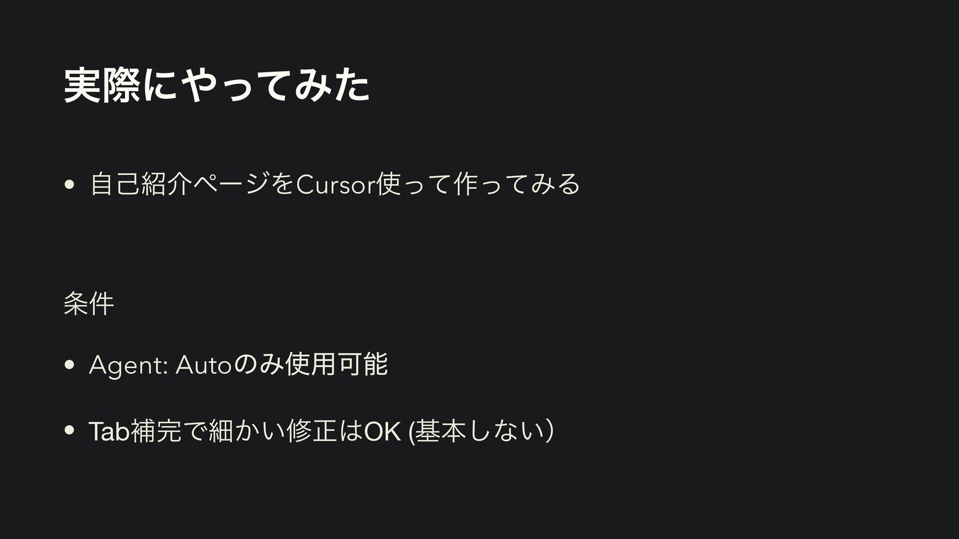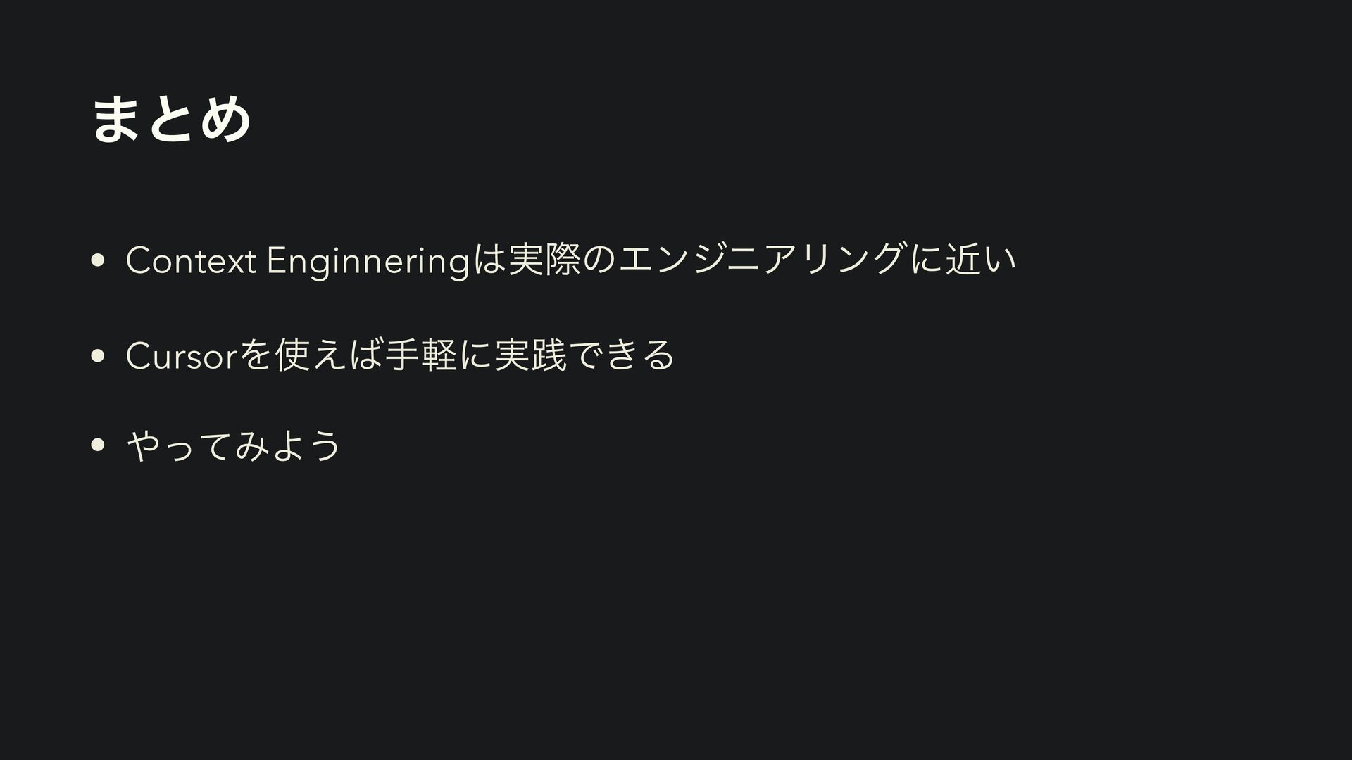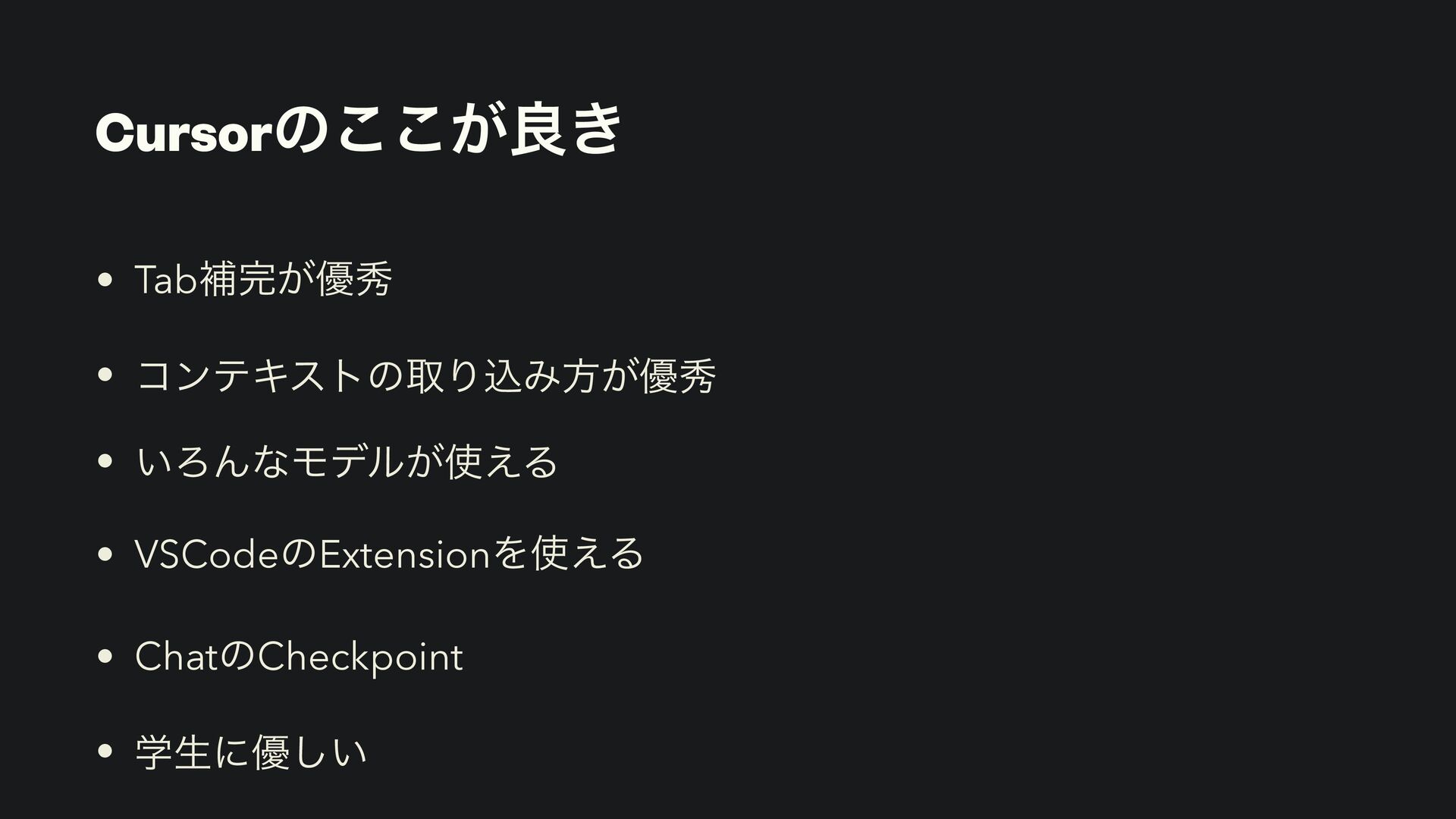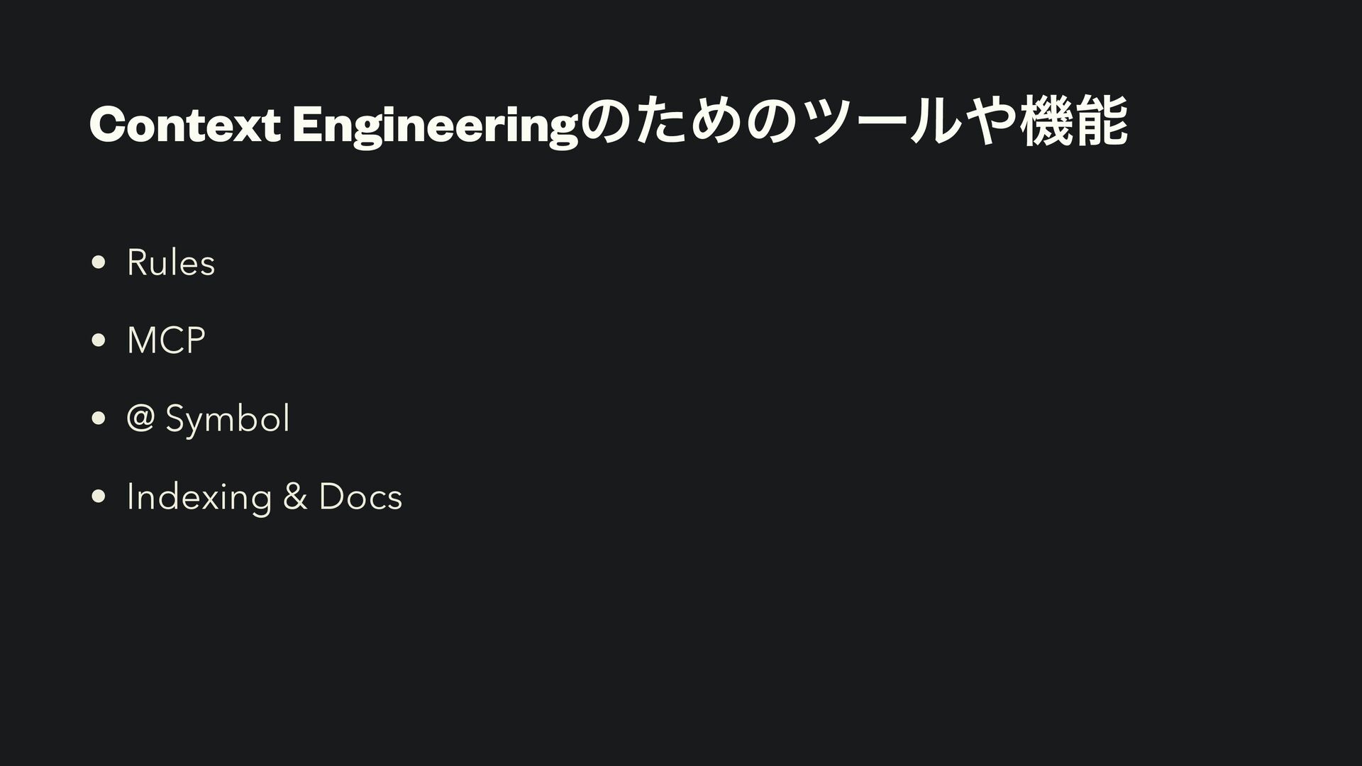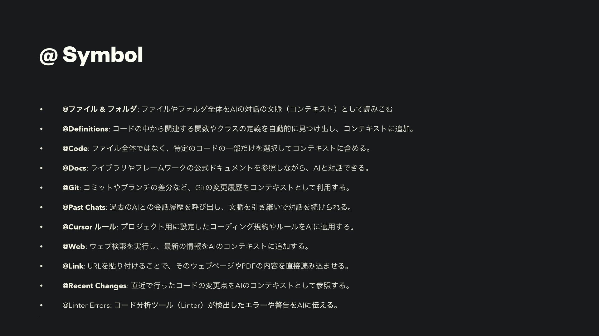 nitions: ίʔυͷத͔Βؔ࿈͢ΔؔΫϥεͷఆٛΛࣗಈతʹݟ͚ͭग़͠ɺίϯςΩετʹՃɻ • @Code: ϑΝΠϧશମͰͳ͘ɺಛఆͷίʔυͷҰ෦͚ͩΛબͯ͠ίϯςΩετʹؚΊΔɻ • @Docs: ϥΠϒϥϦϑϨʔϜϫʔΫͷެࣜυΩϡϝϯτΛࢀর͠ͳ͕ΒɺAIͱରͰ͖Δɻ • @Git: ίϛοτϒϥϯνͷࠩͳͲɺGitͷมߋཤྺΛίϯςΩετͱͯ͠ར༻͢Δɻ • @Past Chats: աڈͷAIͱͷձཤྺΛݺͼग़͠ɺจ຺ΛҾ͖ܧ͍ͰରΛଓ͚ΒΕΔɻ • @Cursor ϧʔϧ: ϓϩδΣΫτ༻ʹઃఆͨ͠ίʔσΟϯάنϧʔϧΛAIʹద༻͢Δɻ • @Web: ΣϒݕࡧΛ࣮ߦ͠ɺ࠷৽ͷใΛAIͷίϯςΩετʹՃ͢Δɻ • @Link: URLΛషΓ͚Δ͜ͱͰɺͦͷΣϒϖʔδPDFͷ༰ΛಡΈࠐ·ͤΔɻ • @Recent Changes: ۙͰߦͬͨίʔυͷมߋΛAIͷίϯςΩετͱͯ͠ࢀর͢Δɻ • @Linter Errors: ίʔυੳπʔϧʢLinterʣ͕ݕग़ͨ͠ΤϥʔܯࠂΛAIʹ͑Δɻ •