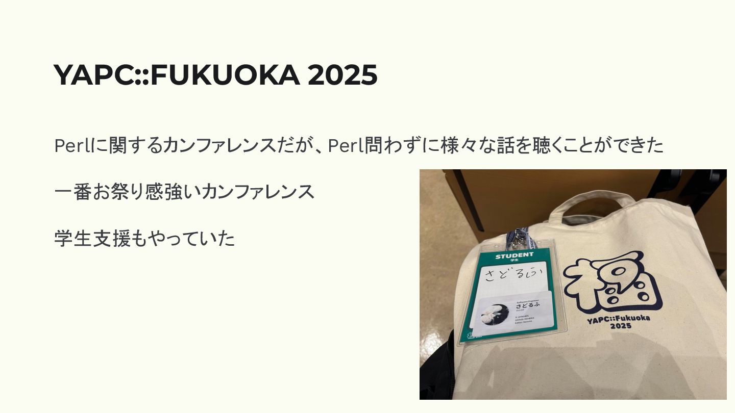 Perlに関するカンファレンスだが、Perl問わずに様々な話を聴くことができた 一番お祭り感強いカンファレンス 学生支援もやっていた YAPC::FUKUOKA 2025