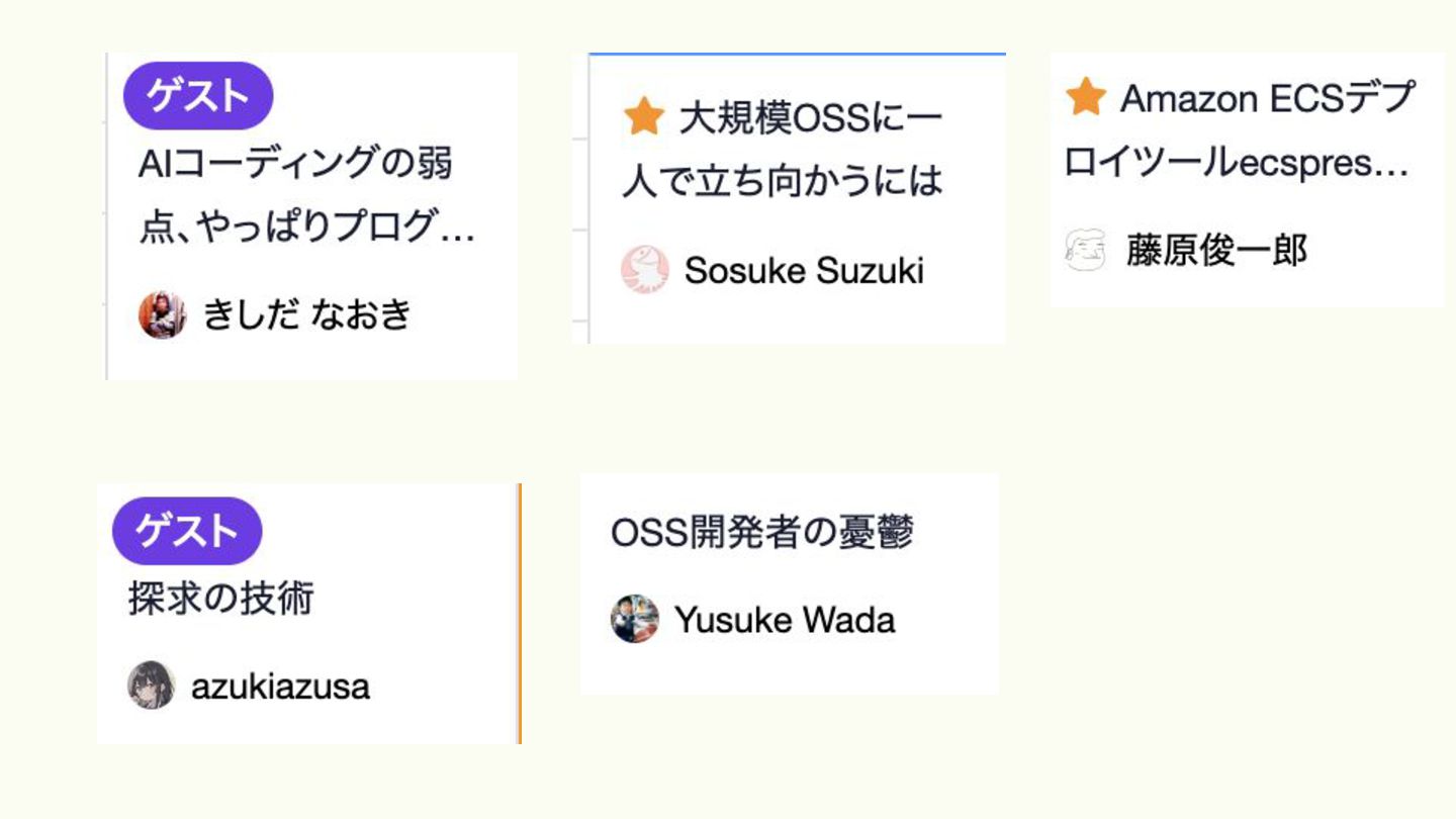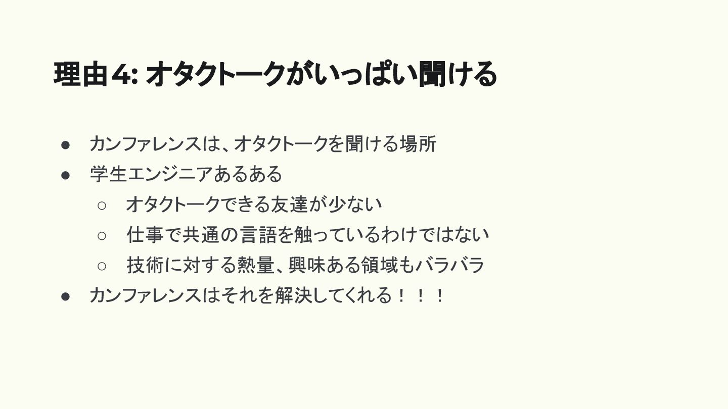 • カンファレンスは、オタクトークを聞ける場所 • 学生エンジニアあるある ◦ オタクトークできる友達が少ない ◦ 仕事で共通の言語を触っているわけではない ◦ 技術に対する熱量、興味ある領域もバラバラ