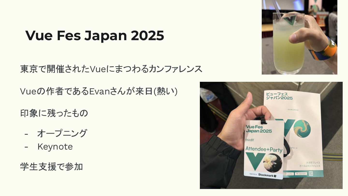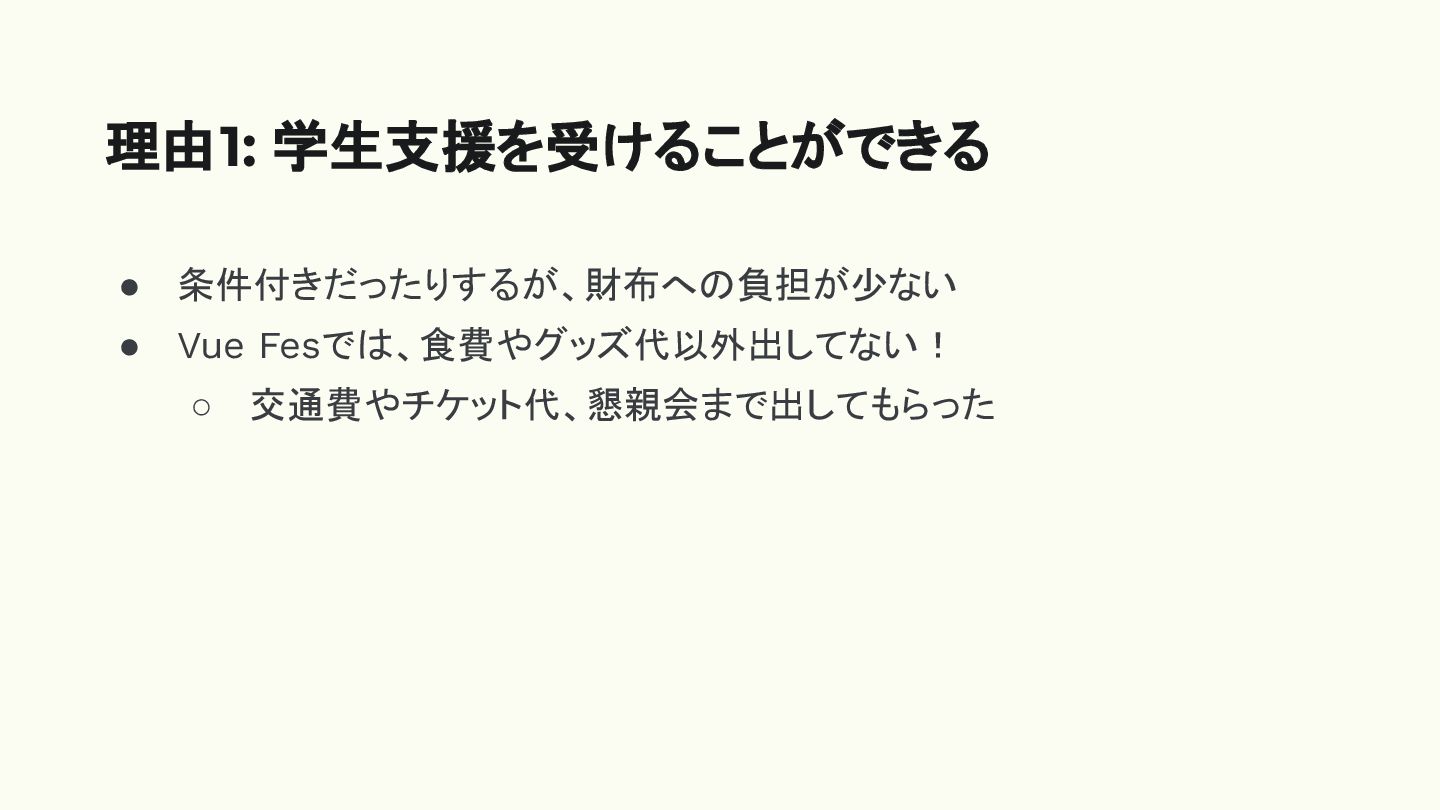 • 条件付きだったりするが、財布への負担が少ない • Vue Fesでは、食費やグッズ代以外出してない! ◦ 交通費やチケット代、懇親会まで出してもらった 理由1: 学生支援を受けることができる