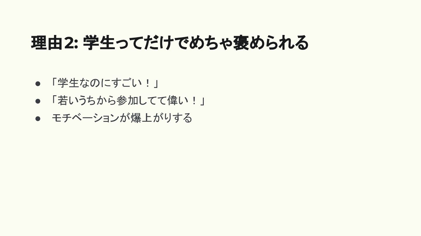 • 「学生なのにすごい!」 • 「若いうちから参加してて偉い!」 • モチベーションが爆上がりする 理由2: 学生ってだけでめちゃ褒められる