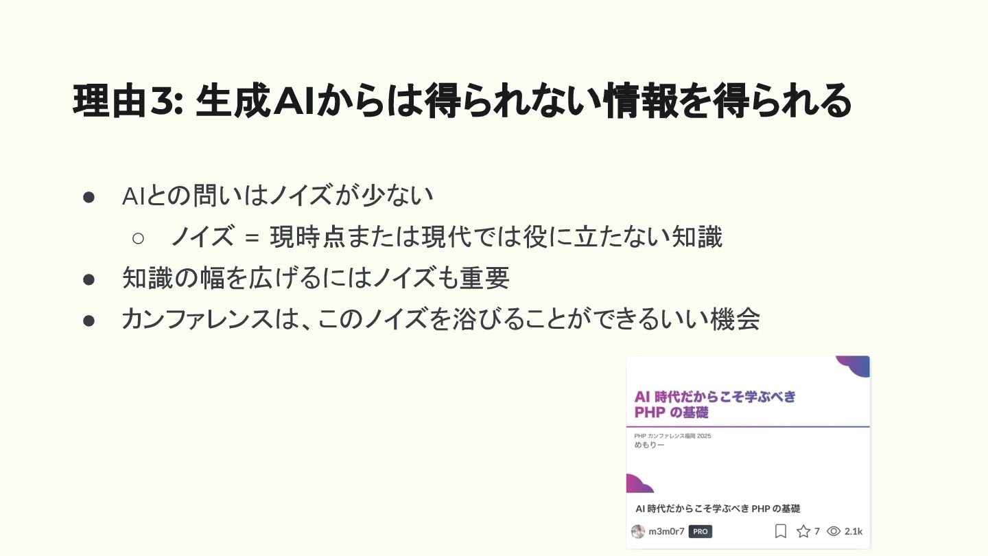 • AIとの問いはノイズが少ない ◦ ノイズ = 現時点または現代では役に立たない知識 • 知識の幅を広げるにはノイズも重要 • カンファレンスは、このノイズを浴びることができるいい機会