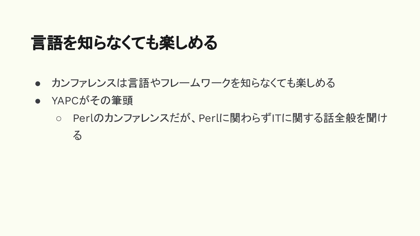 • カンファレンスは言語やフレームワークを知らなくても楽しめる • YAPCがその筆頭 ◦ Perlのカンファレンスだが、Perlに関わらずITに関する話全般を聞け る 言語を知らなくても楽しめる