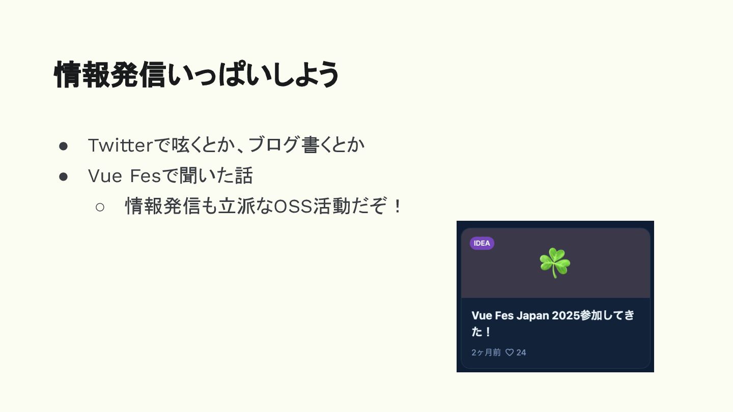 • Twitterで呟くとか、ブログ書くとか • Vue Fesで聞いた話 ◦ 情報発信も立派なOSS活動だぞ! 情報発信いっぱいしよう