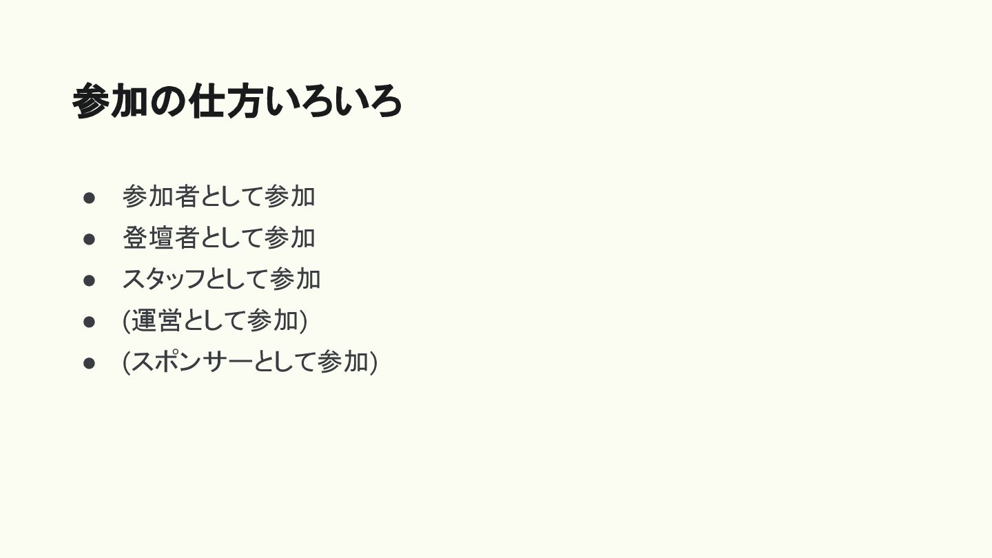 • 参加者として参加 • 登壇者として参加 • スタッフとして参加 • (運営として参加) • (スポンサーとして参加)
