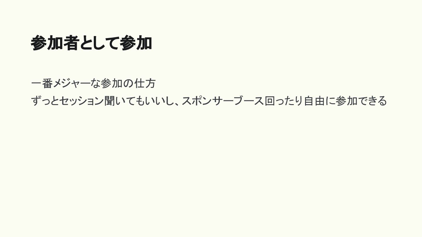 一番メジャーな参加の仕方 ずっとセッション聞いてもいいし、スポンサーブース回ったり自由に参加できる 参加者として参加