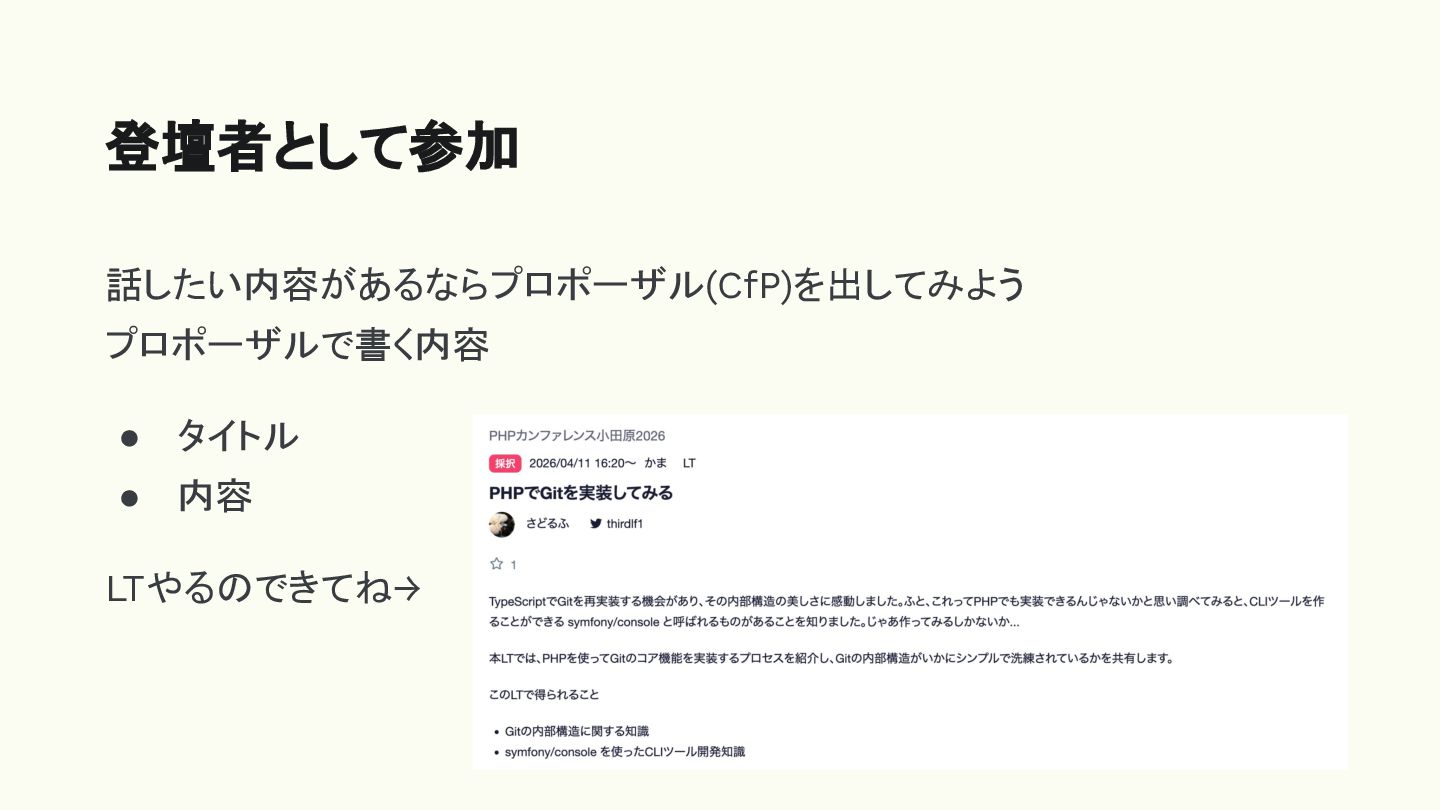 話したい内容があるならプロポーザル(CfP)を出してみよう プロポーザルで書く内容 • タイトル • 内容 LTやるのできてね→ 登壇者として参加