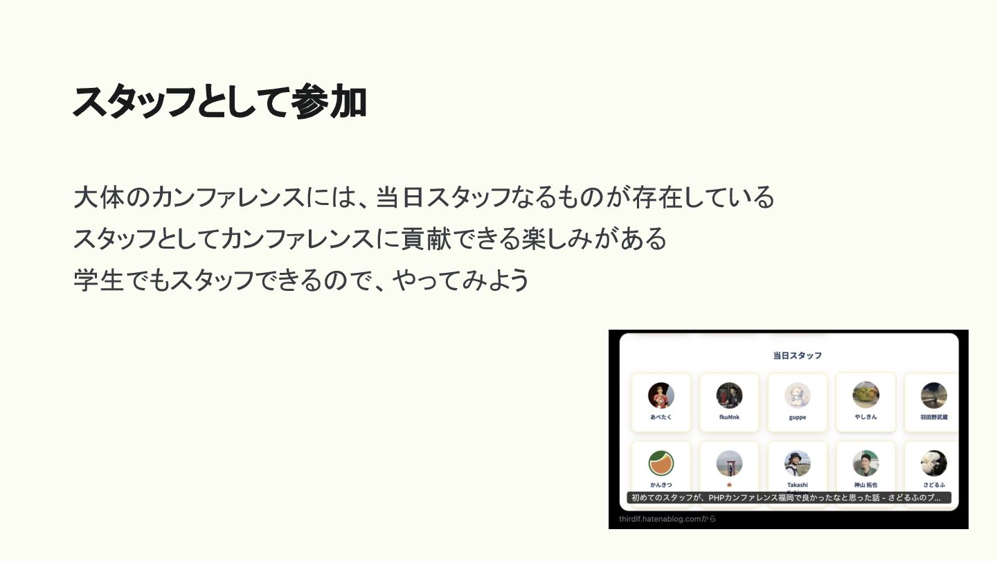 大体のカンファレンスには、当日スタッフなるものが存在している スタッフとしてカンファレンスに貢献できる楽しみがある 学生でもスタッフできるので、やってみよう スタッフとして参加