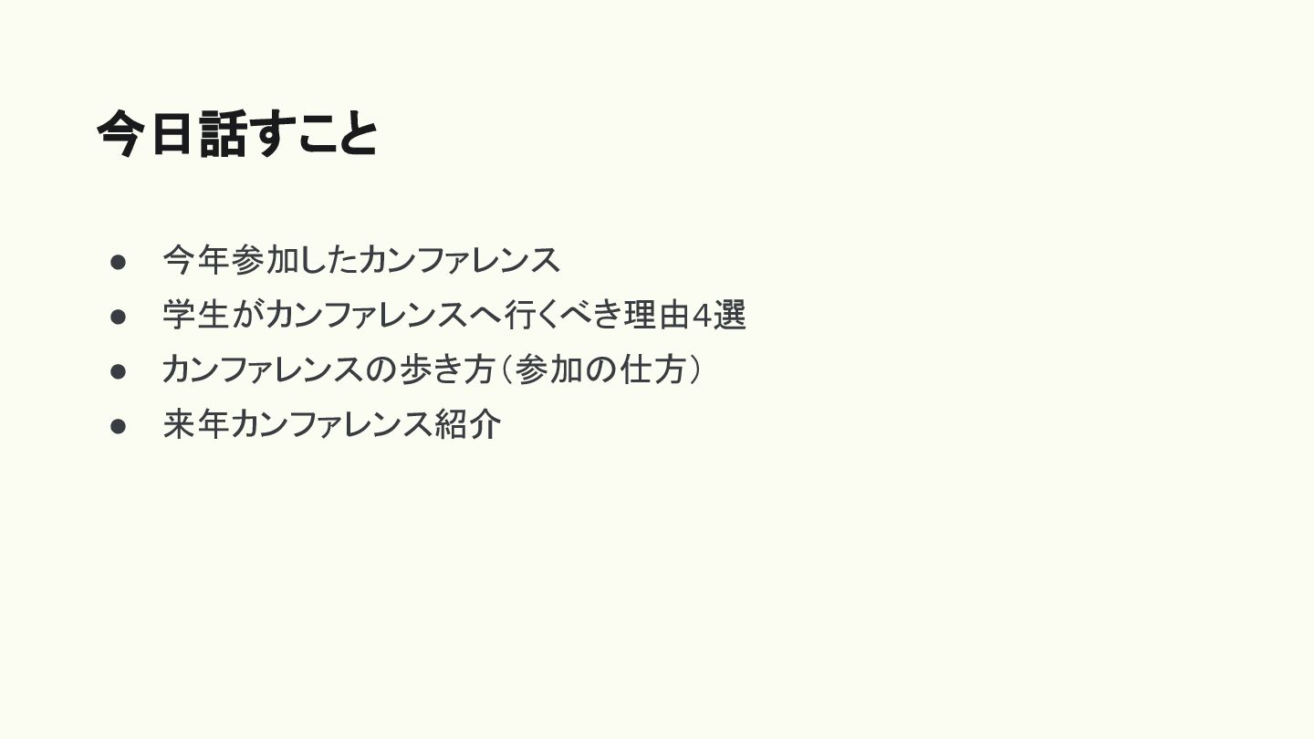 • 今年参加したカンファレンス • 学生がカンファレンスへ行くべき理由4選 • カンファレンスの歩き方(参加の仕方) • 来年カンファレンス紹介 今日話すこと
