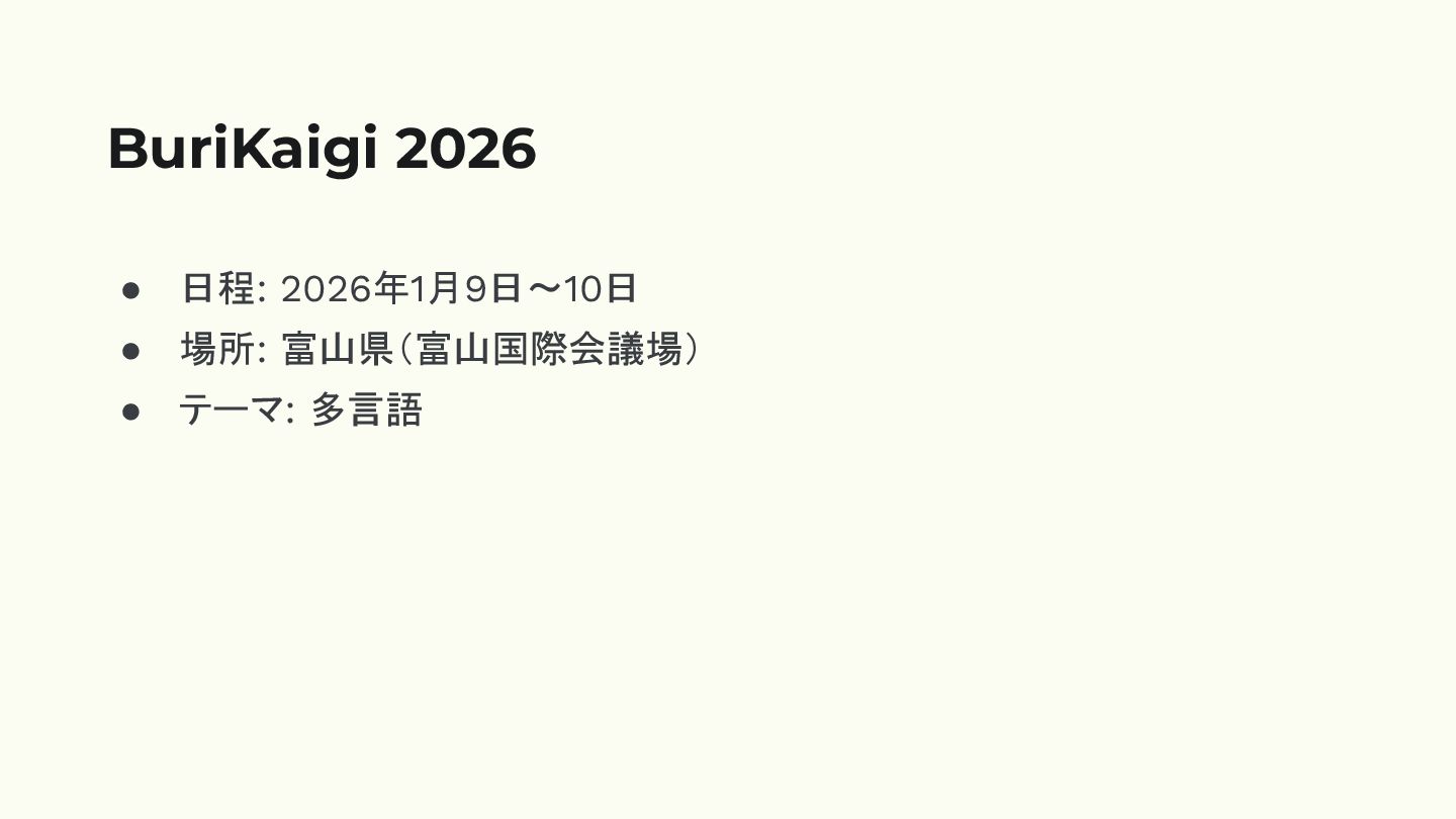 • 日程: 2026年1月9日〜10日 • 場所: 富山県(富山国際会議場) • テーマ: 多言語 BuriKaigi