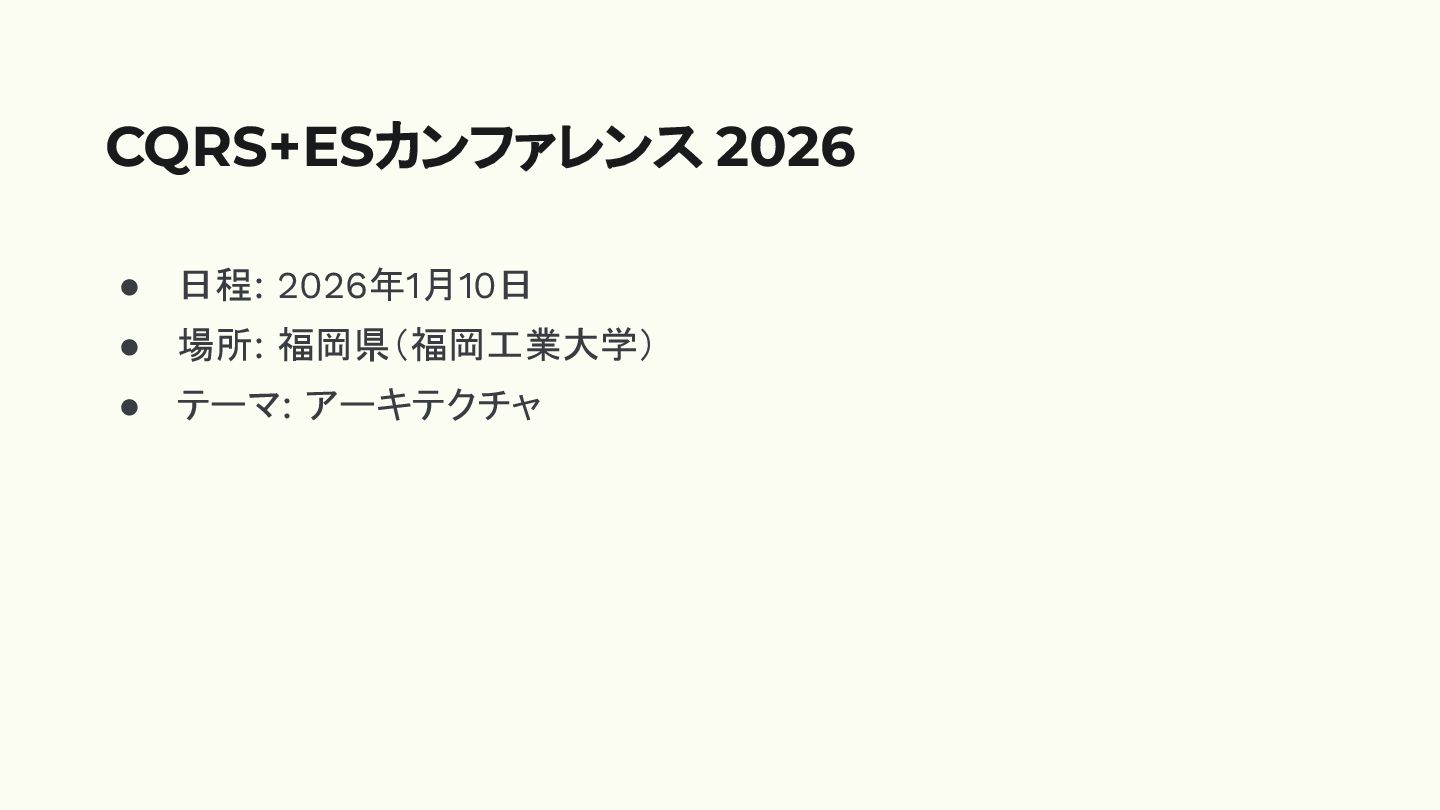 • 日程: 2026年1月10日 • 場所: 福岡県(福岡工業大学) • テーマ: アーキテクチャ CQRS+ESカンファレンス