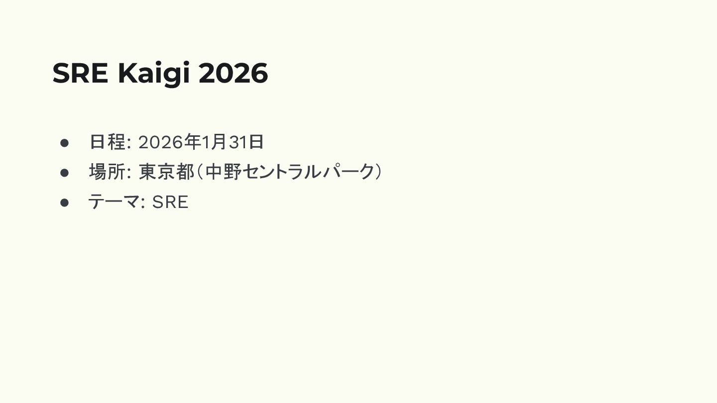• 日程: 2026年1月31日 • 場所: 東京都(中野セントラルパーク) • テーマ: SRE SRE