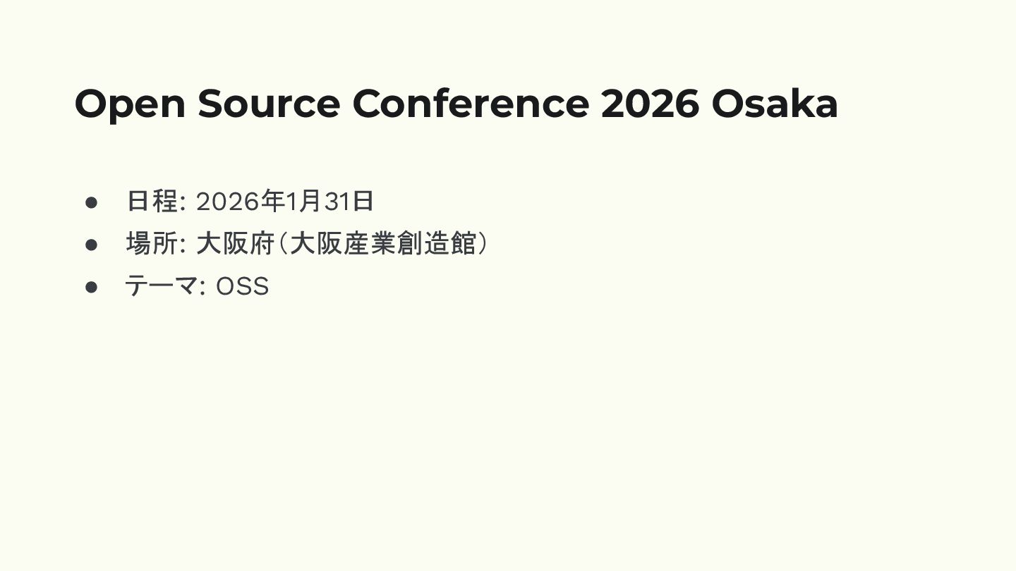 • 日程: 2026年1月31日 • 場所: 大阪府(大阪産業創造館) • テーマ: OSS Open