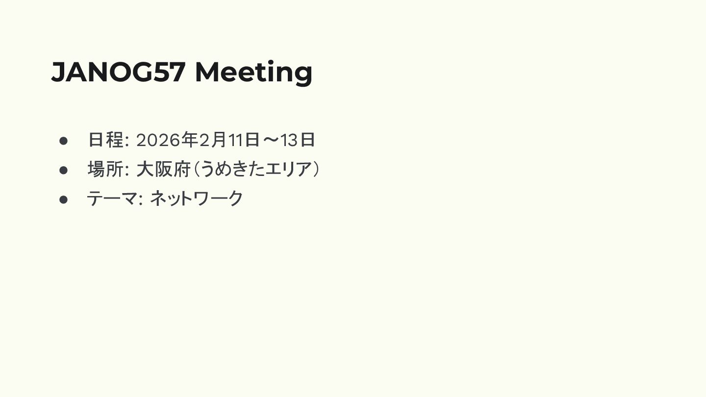 • 日程: 2026年2月11日〜13日 • 場所: 大阪府(うめきたエリア) • テーマ: ネットワーク JANOG57