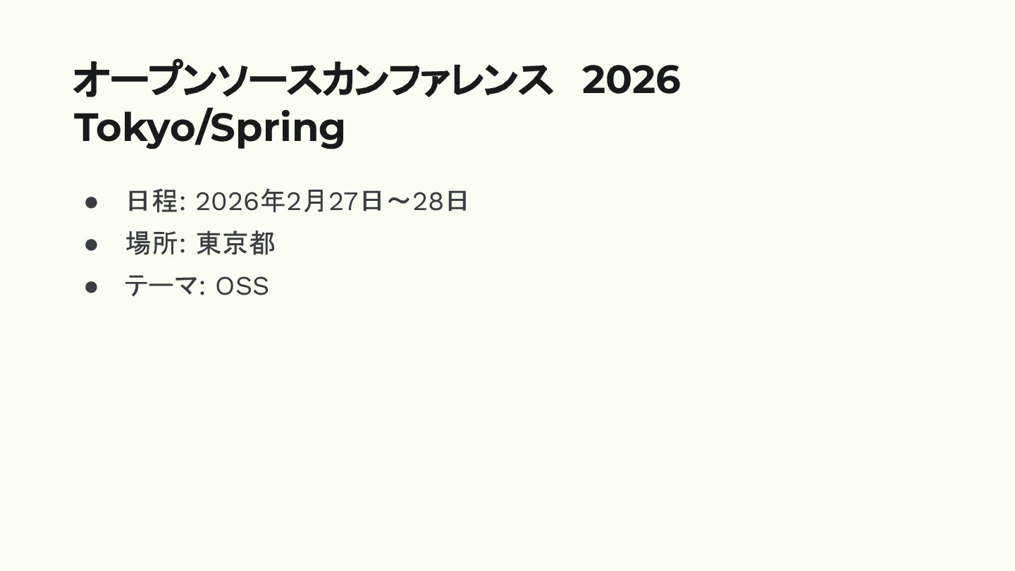 • 日程: 2026年2月27日〜28日 • 場所: 東京都 • テーマ: OSS オープンソースカンファレンス