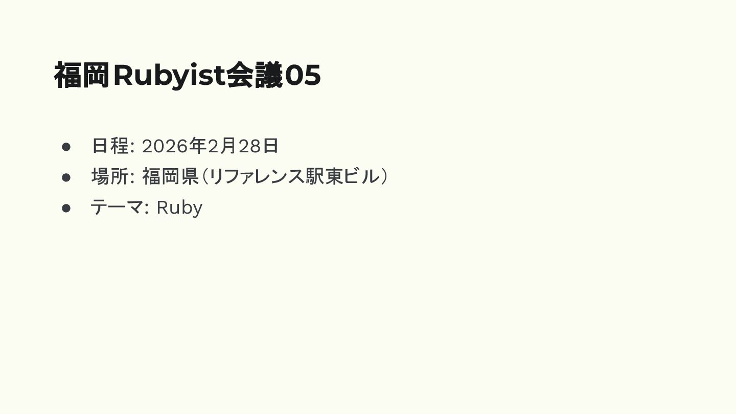 • 日程: 2026年2月28日 • 場所: 福岡県(リファレンス駅東ビル) • テーマ: Ruby 福岡Rubyist会議05
