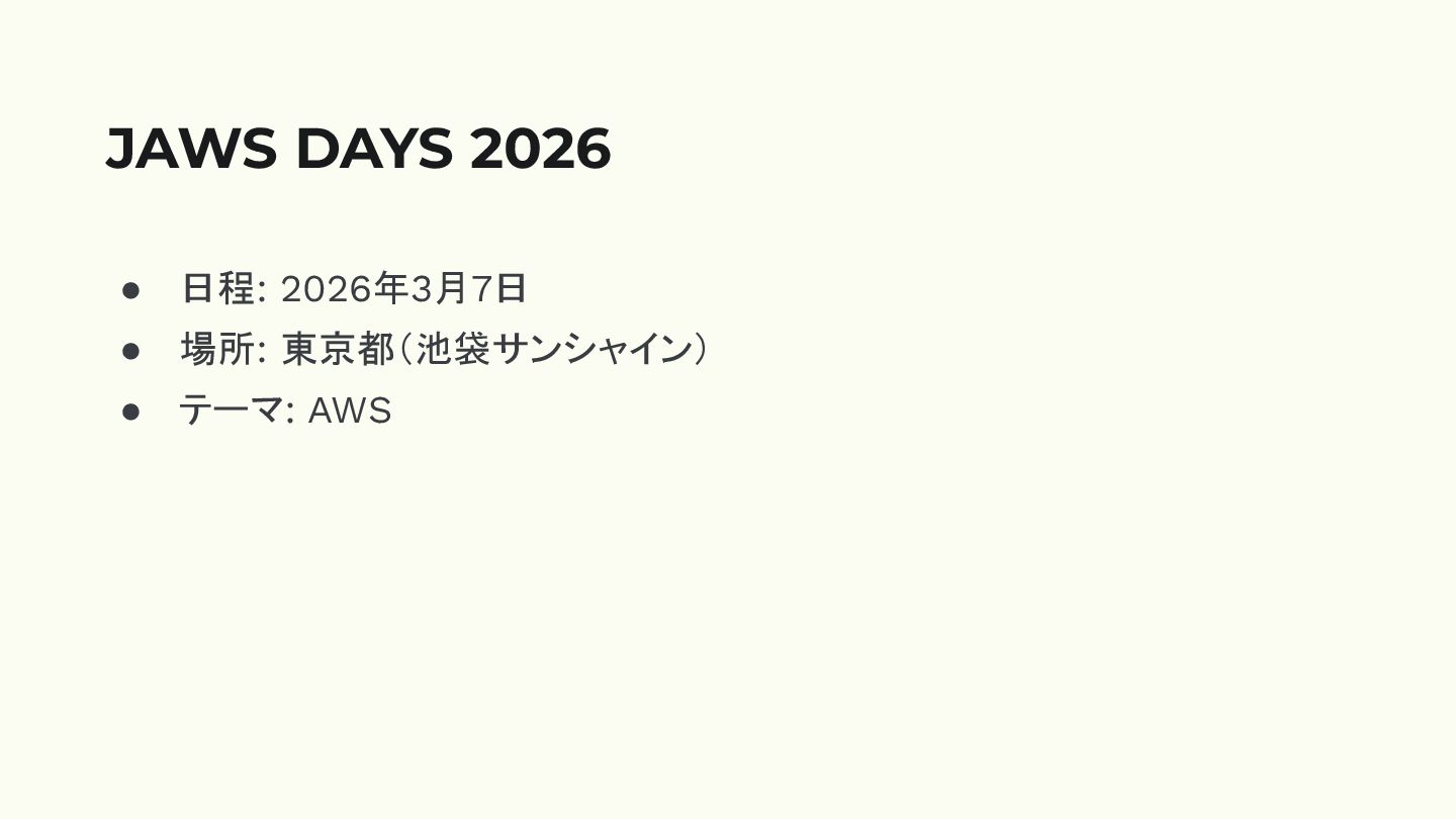 • 日程: 2026年3月7日 • 場所: 東京都(池袋サンシャイン) • テーマ: AWS JAWS