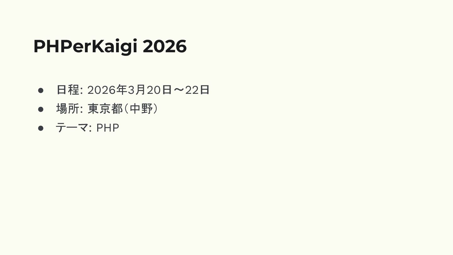 • 日程: 2026年3月20日〜22日 • 場所: 東京都(中野) • テーマ: PHP PHPerKaigi
