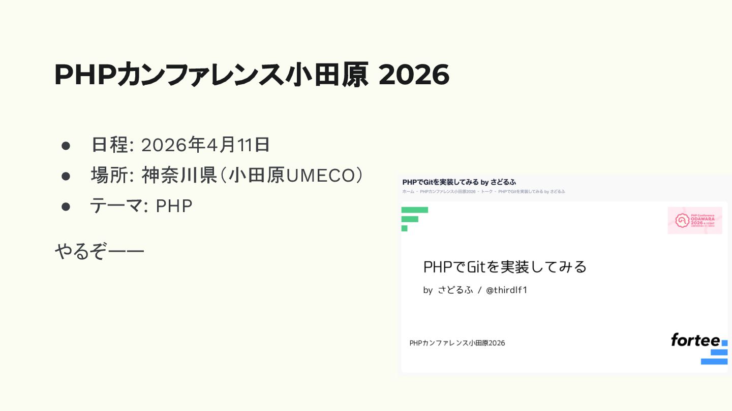 • 日程: 2026年4月11日 • 場所: 神奈川県(小田原UMECO) • テーマ: PHP やるぞーー
