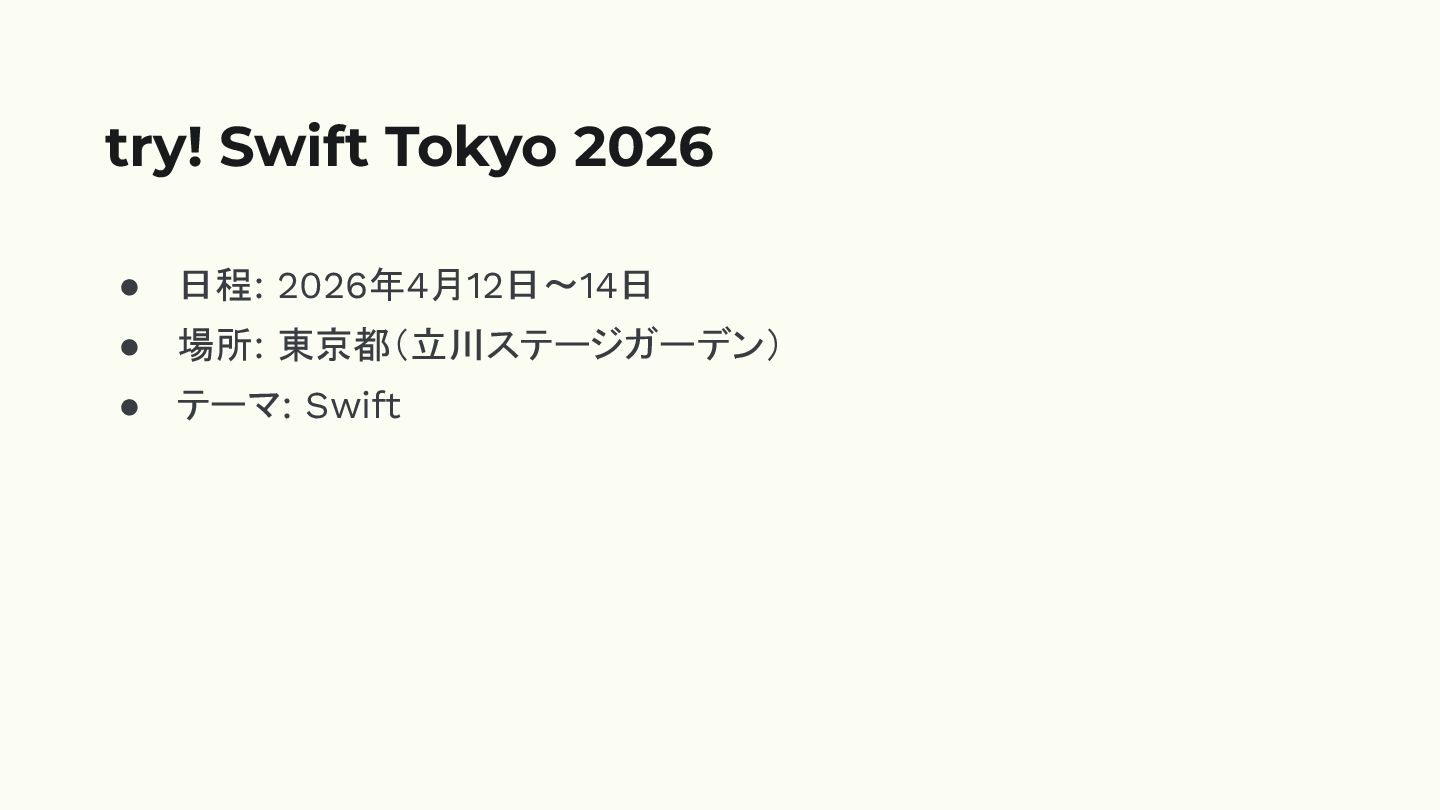 • 日程: 2026年4月12日〜14日 • 場所: 東京都(立川ステージガーデン) • テーマ: Swift try!