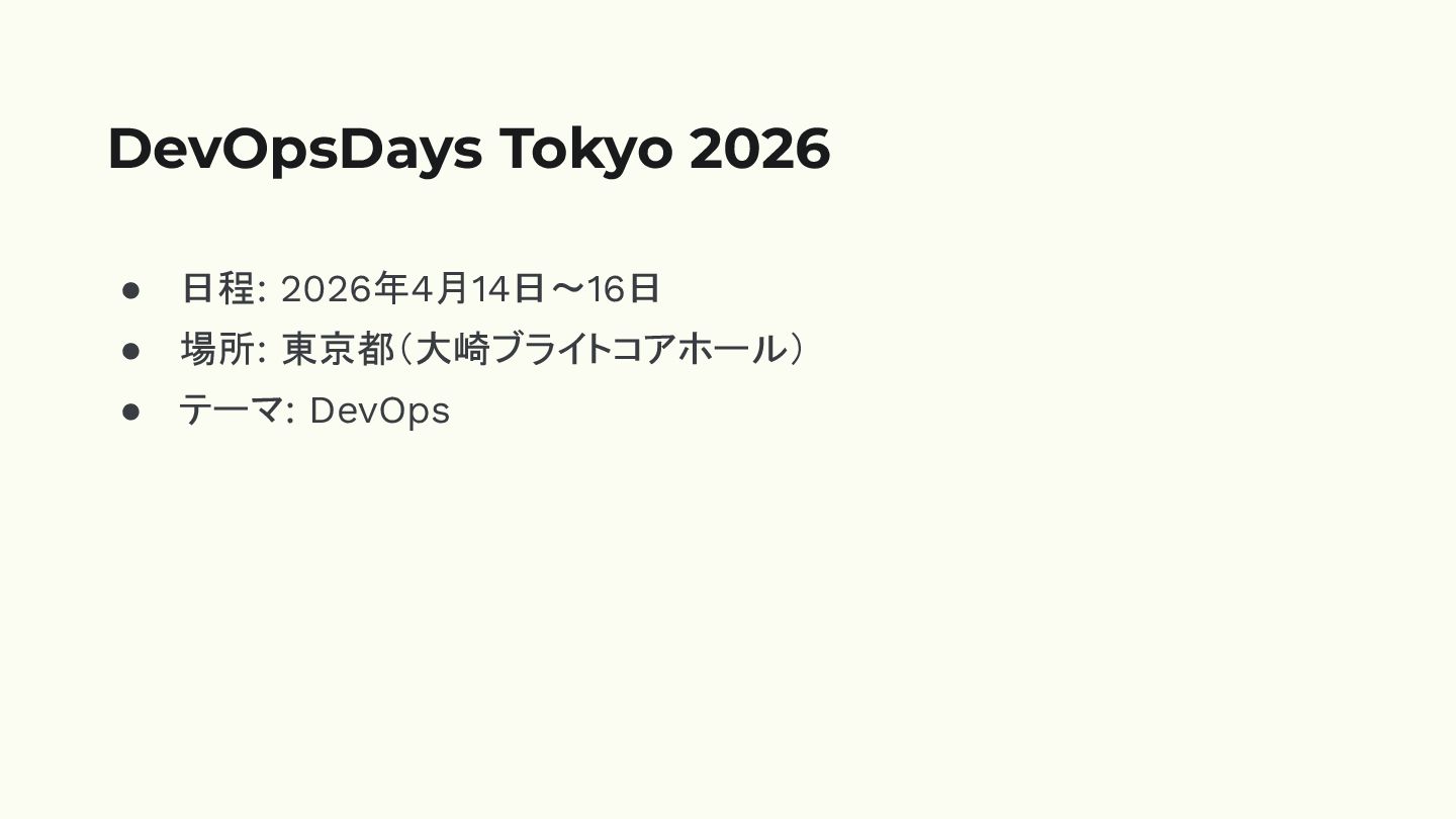 • 日程: 2026年4月14日〜16日 • 場所: 東京都(大崎ブライトコアホール) • テーマ: DevOps DevOpsDays