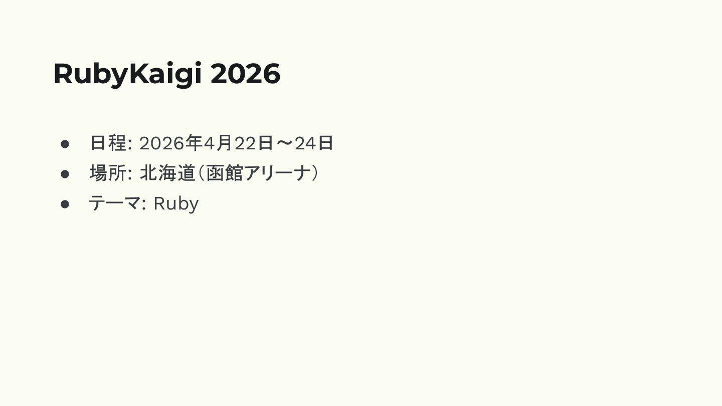 • 日程: 2026年4月22日〜24日 • 場所: 北海道(函館アリーナ) • テーマ: Ruby RubyKaigi