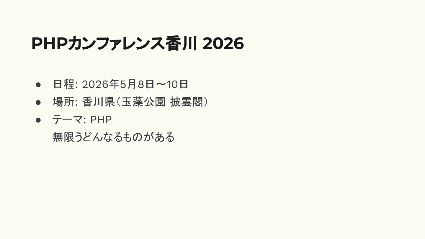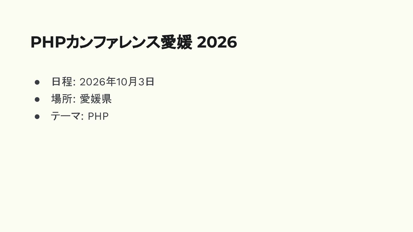 • 日程: 2026年10月3日 • 場所: 愛媛県 • テーマ: PHP PHPカンファレンス愛媛