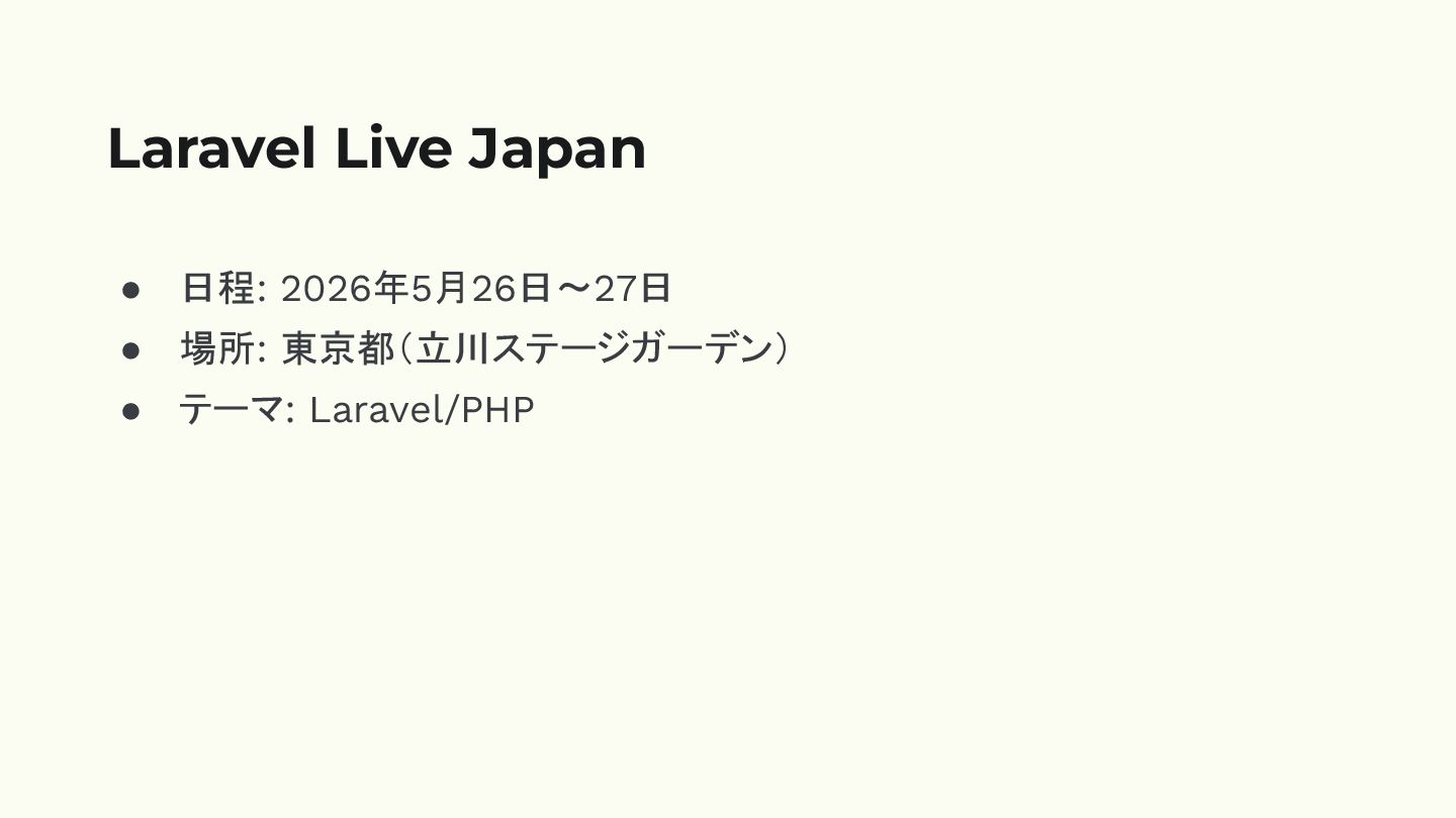 • 日程: 2026年5月26日〜27日 • 場所: 東京都(立川ステージガーデン) • テーマ: Laravel/PHP Laravel