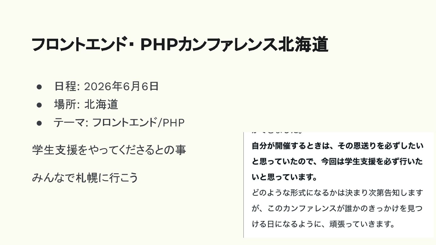 • 日程: 2026年6月6日 • 場所: 北海道 • テーマ: フロントエンド/PHP 学生支援をやってくださるとの事