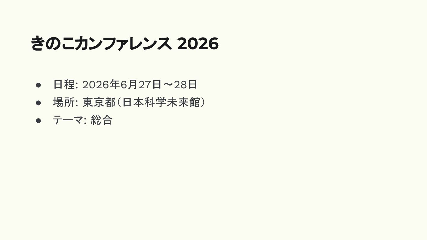 • 日程: 2026年6月27日〜28日 • 場所: 東京都(日本科学未来館) • テーマ: 総合 きのこカンファレンス