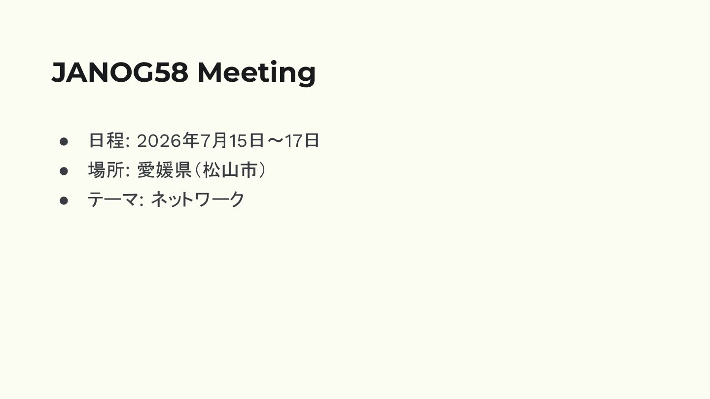 • 日程: 2026年7月15日〜17日 • 場所: 愛媛県(松山市) • テーマ: ネットワーク JANOG58