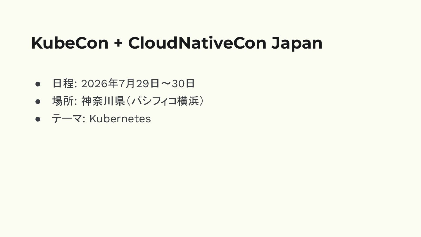 • 日程: 2026年7月29日〜30日 • 場所: 神奈川県(パシフィコ横浜) • テーマ: Kubernetes KubeCon